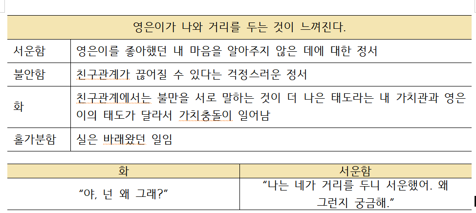 이 경험들이 쌓이면 나는 어느 상황에 화가 나는 사람인지, 서운한 사람인지 알 수 있습니다. 나를 알고 정서를 만나는 것은 나를 모르고 정서에 압도당할 때보다 더 유리한 입장에 서서 문제를 해결하게 됩니다.