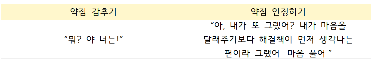 이때 자신의 약점을 알고 더 키워보려는 친구와 자신의 약점을 모른 채 숨기려고 하는 친구의 대응은 다르게 나타납니다.