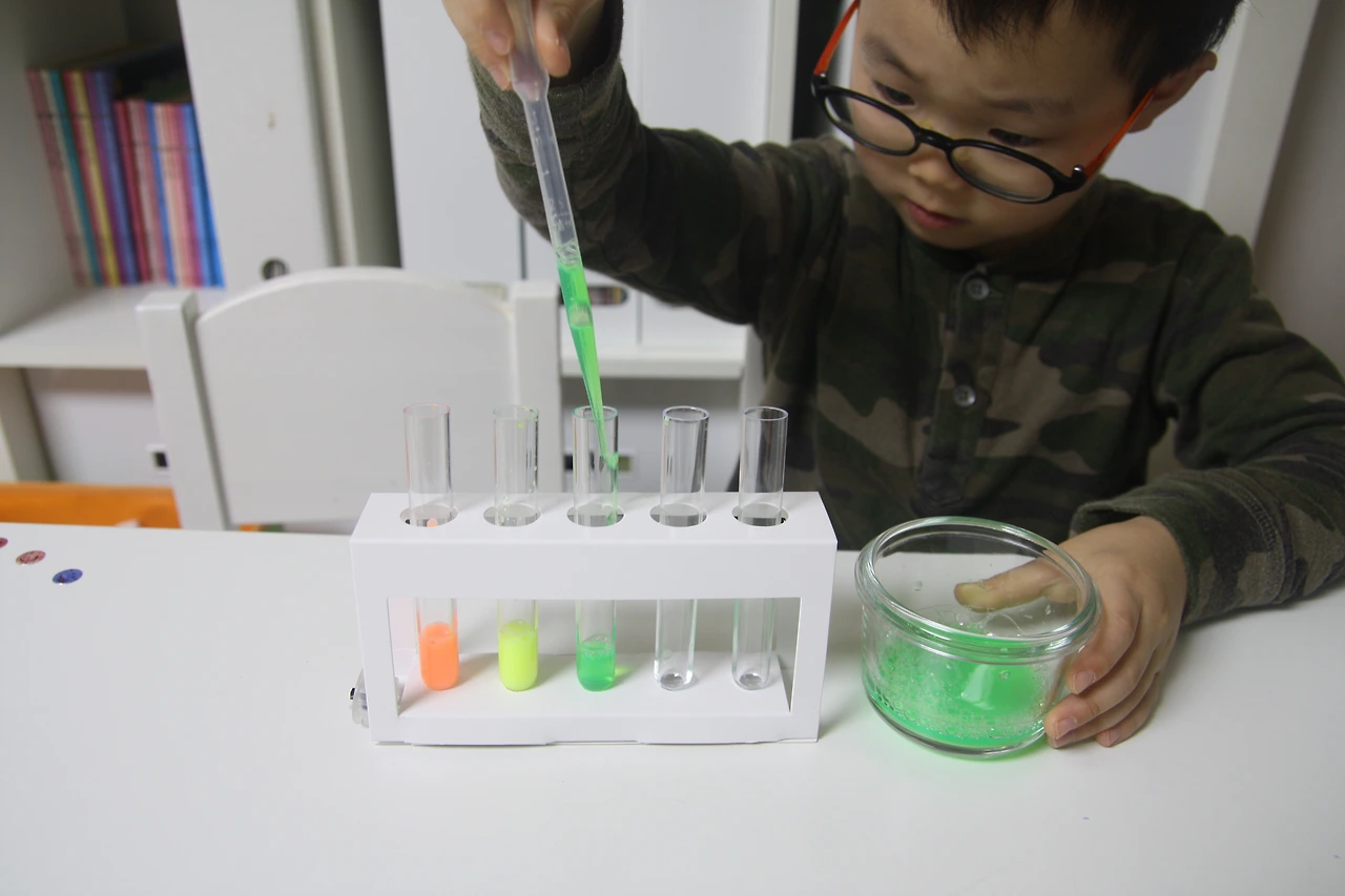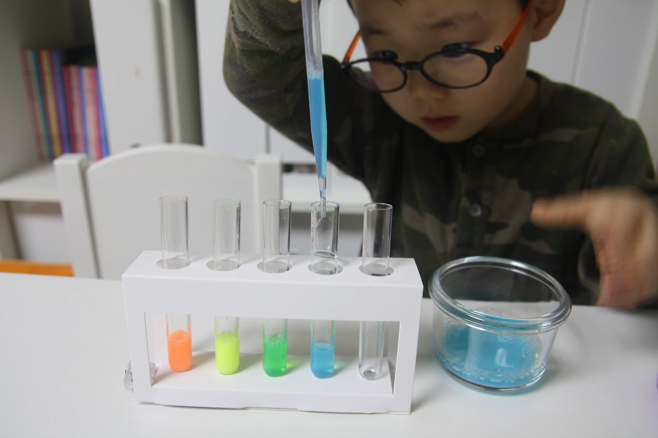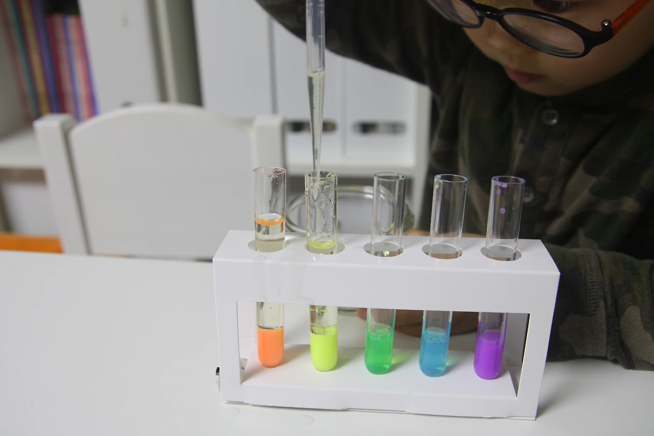 시험관에 예쁜 색깔의 물감을 스포이트로 담으면서