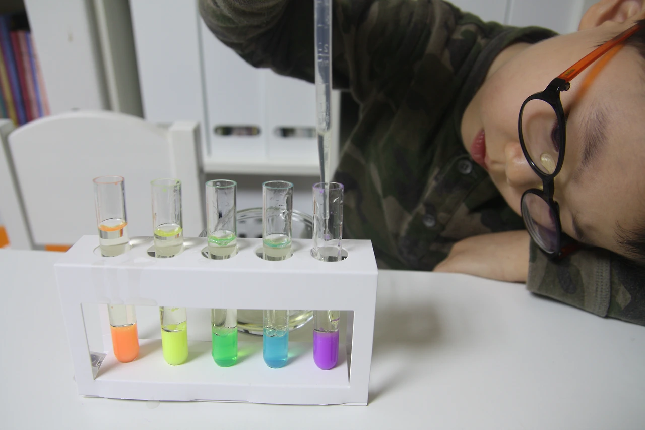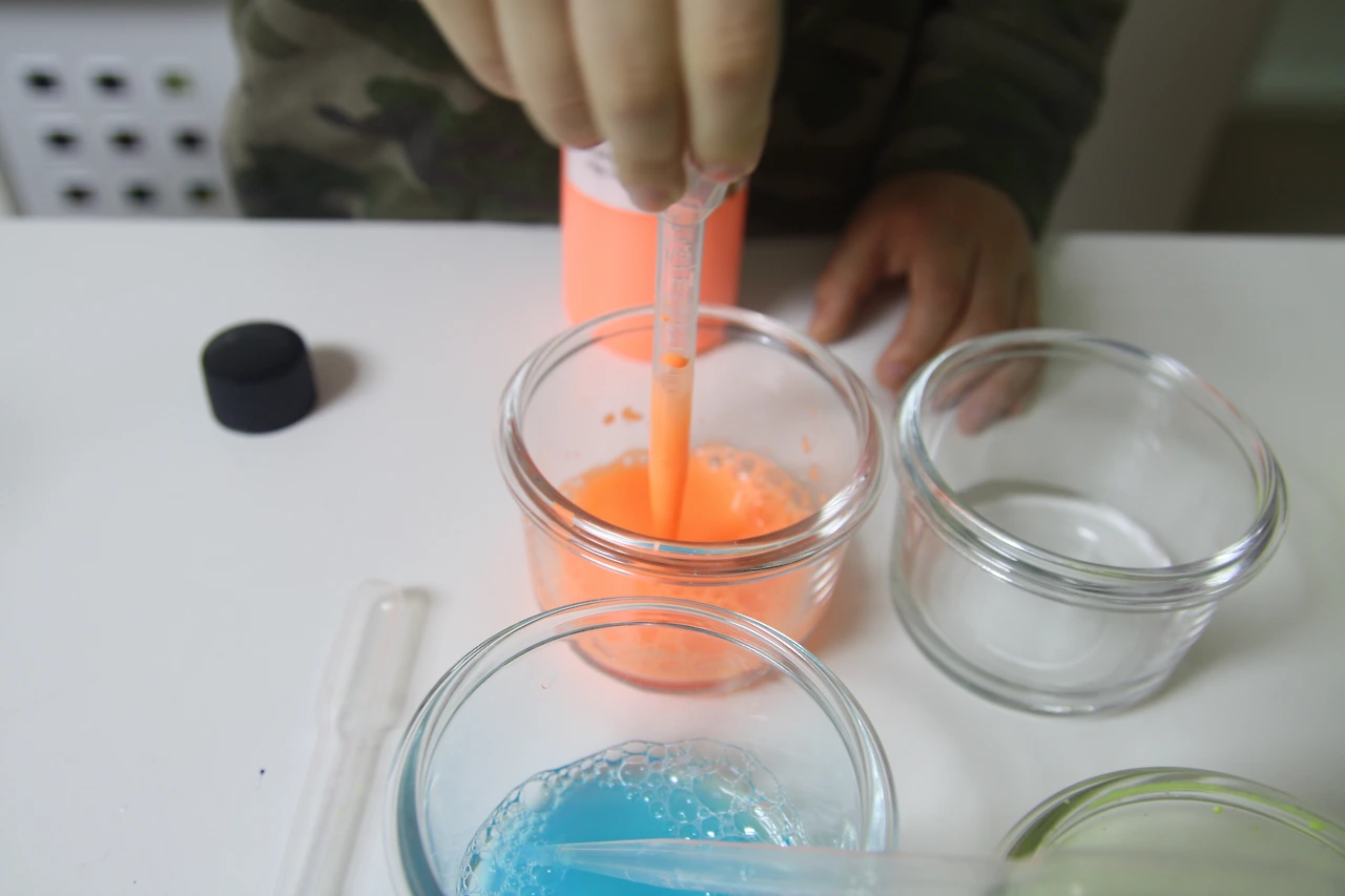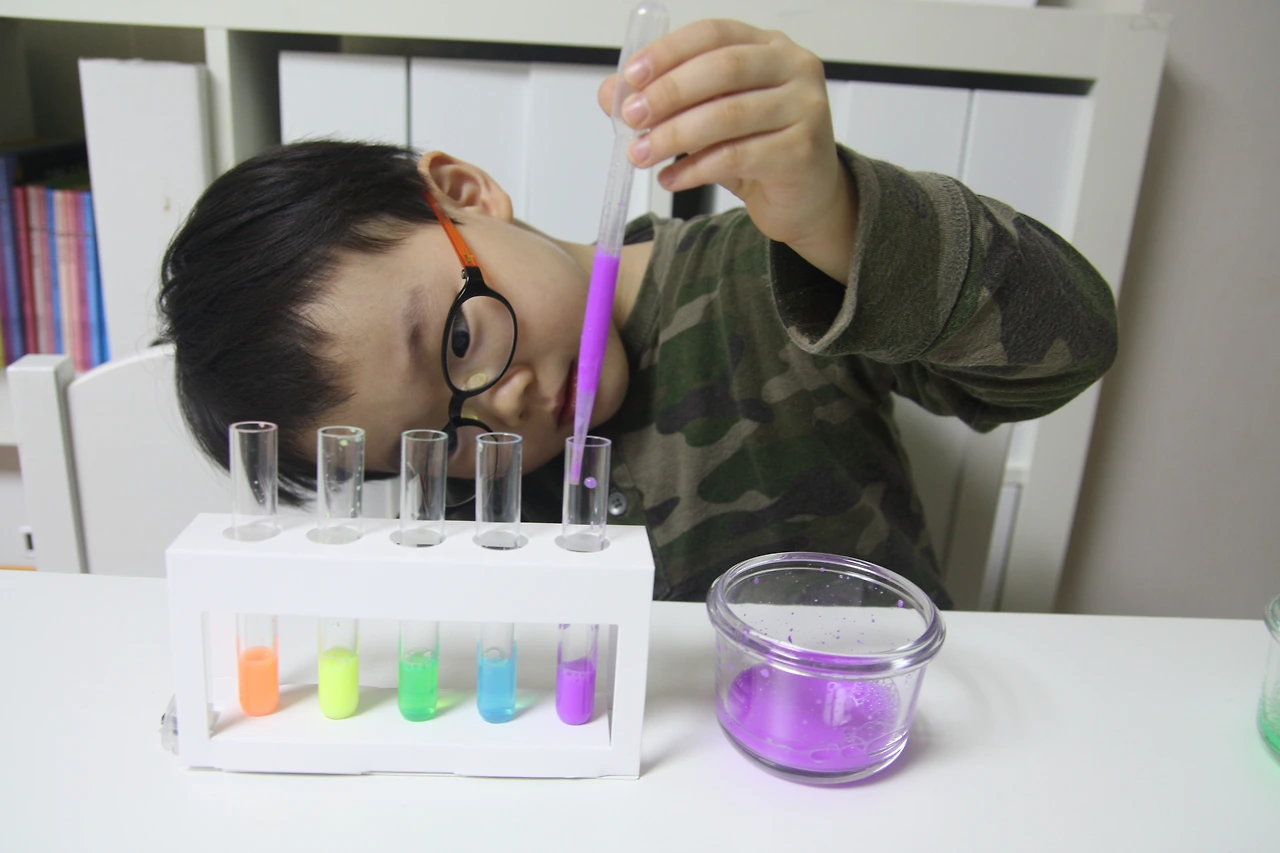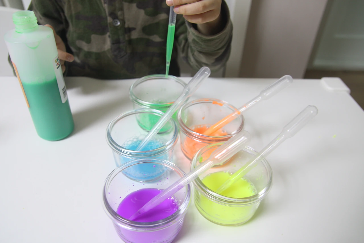 시험관에 예쁜 색깔의 물감을 스포이트로 담으면서
