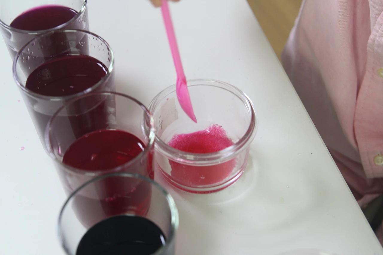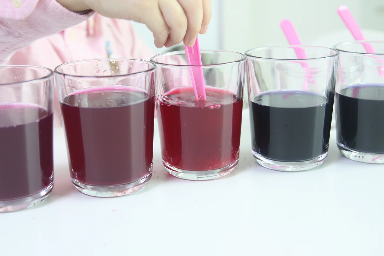 바닥에 가라앉은 구연산을 스푼으로 저어주니 금새 붉은 색깔로 전체가 다 변했습니다.