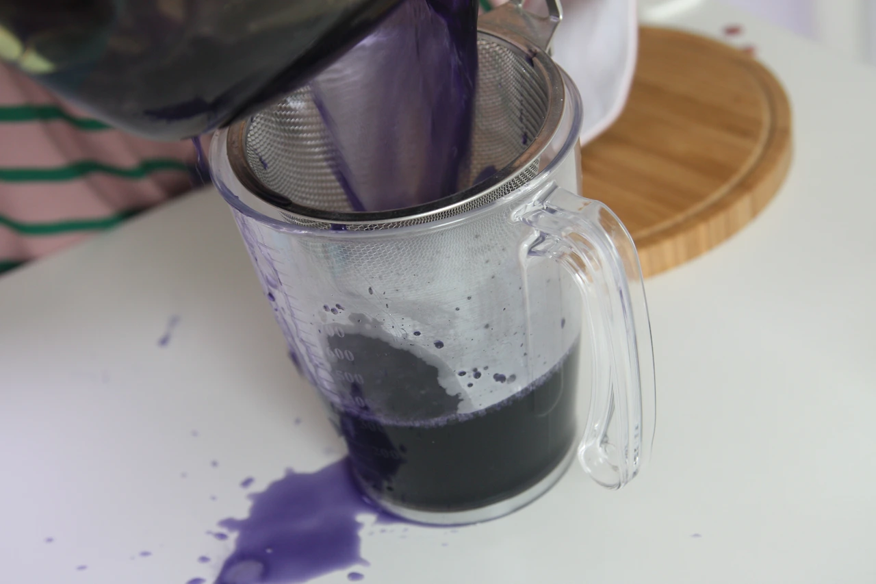 보라색으로 우러나온 양배추 물을 체에 걸러줍니다.