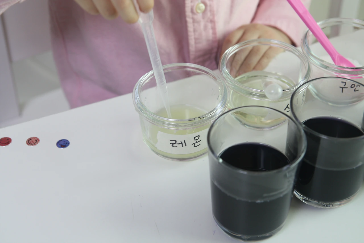 산성 용액과 염기성 용액을 섞어서 색깔 변화를 관찰하는 거예요.