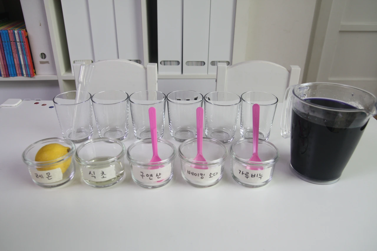 양배추 지시약이 붉은색으로 변한 레몬, 식초, 구연산은 산성,