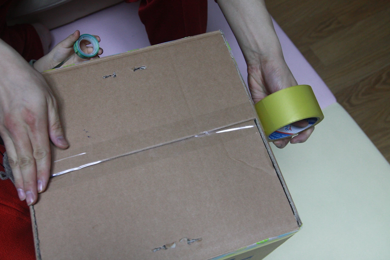 종이 상자에 투명 테이프로 꼼꼼하게 붙여주었습니다.