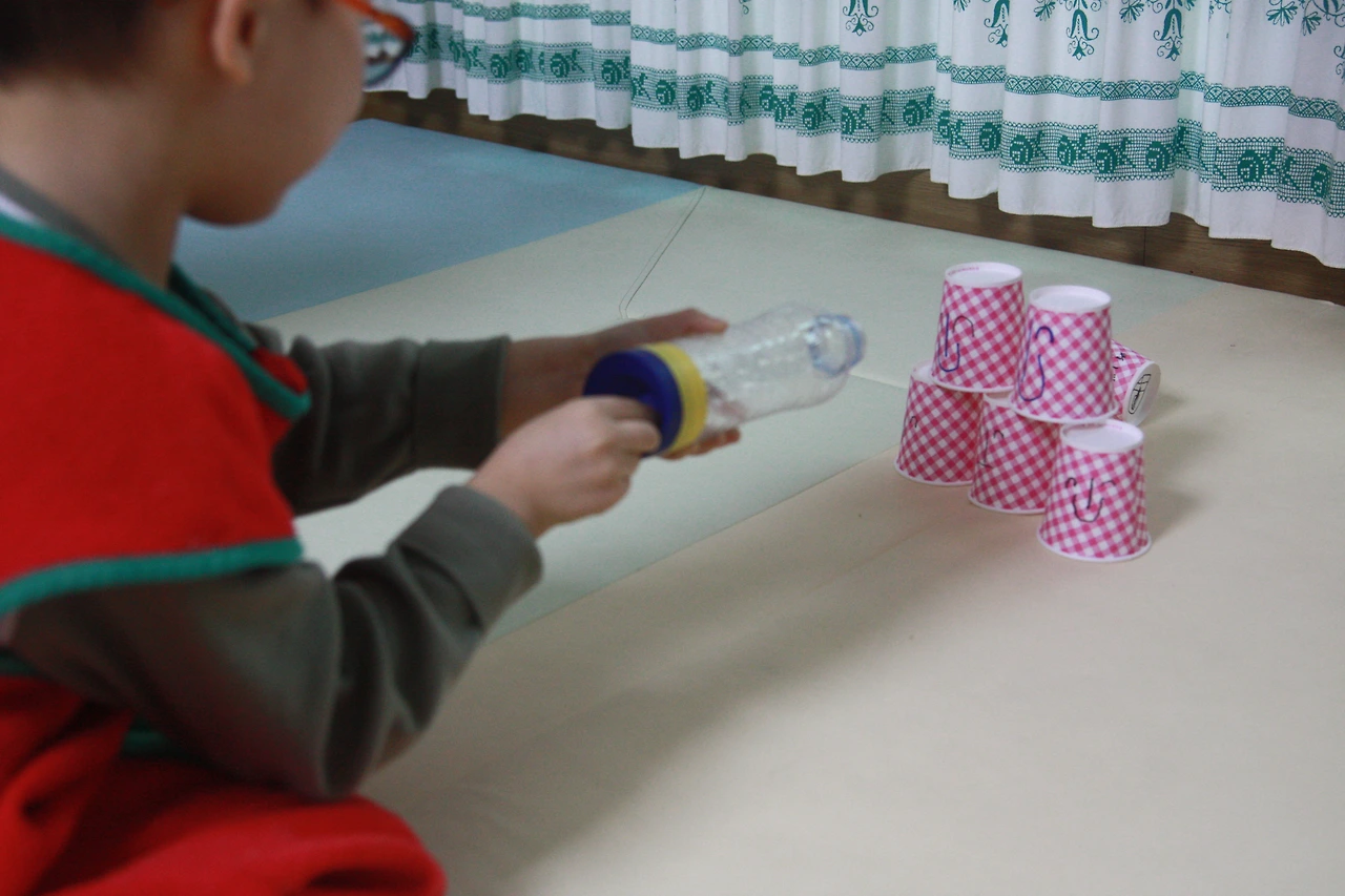 페트병으로 만든 공기 대포에서 나오는 공기의 힘에 의해 종이컵 탑이 쓰러집니다~~~