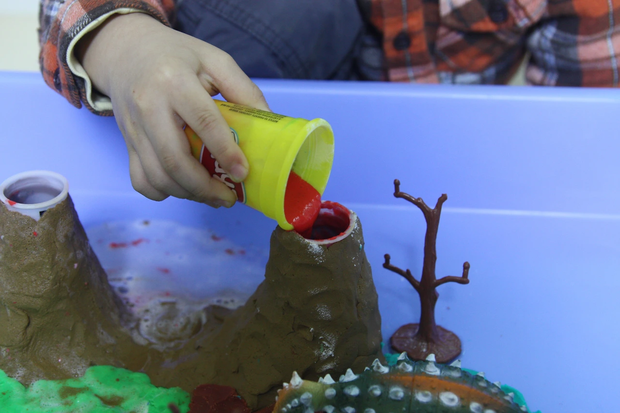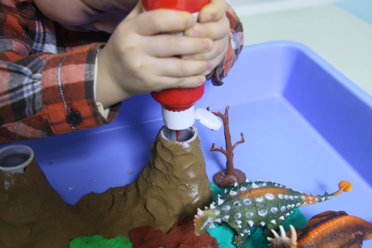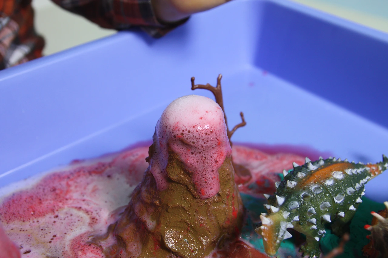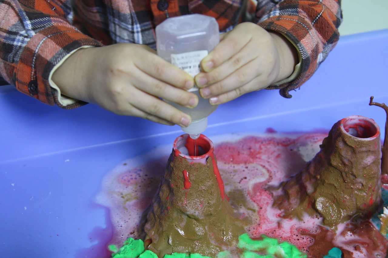그럴듯한 화산 폭발을 위해 빨간색 물감을 넣어줍니다.
