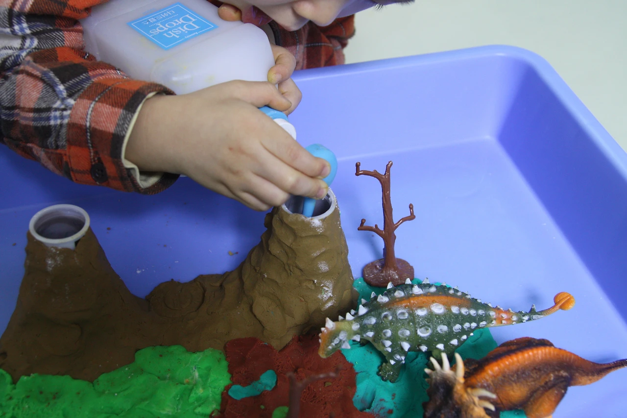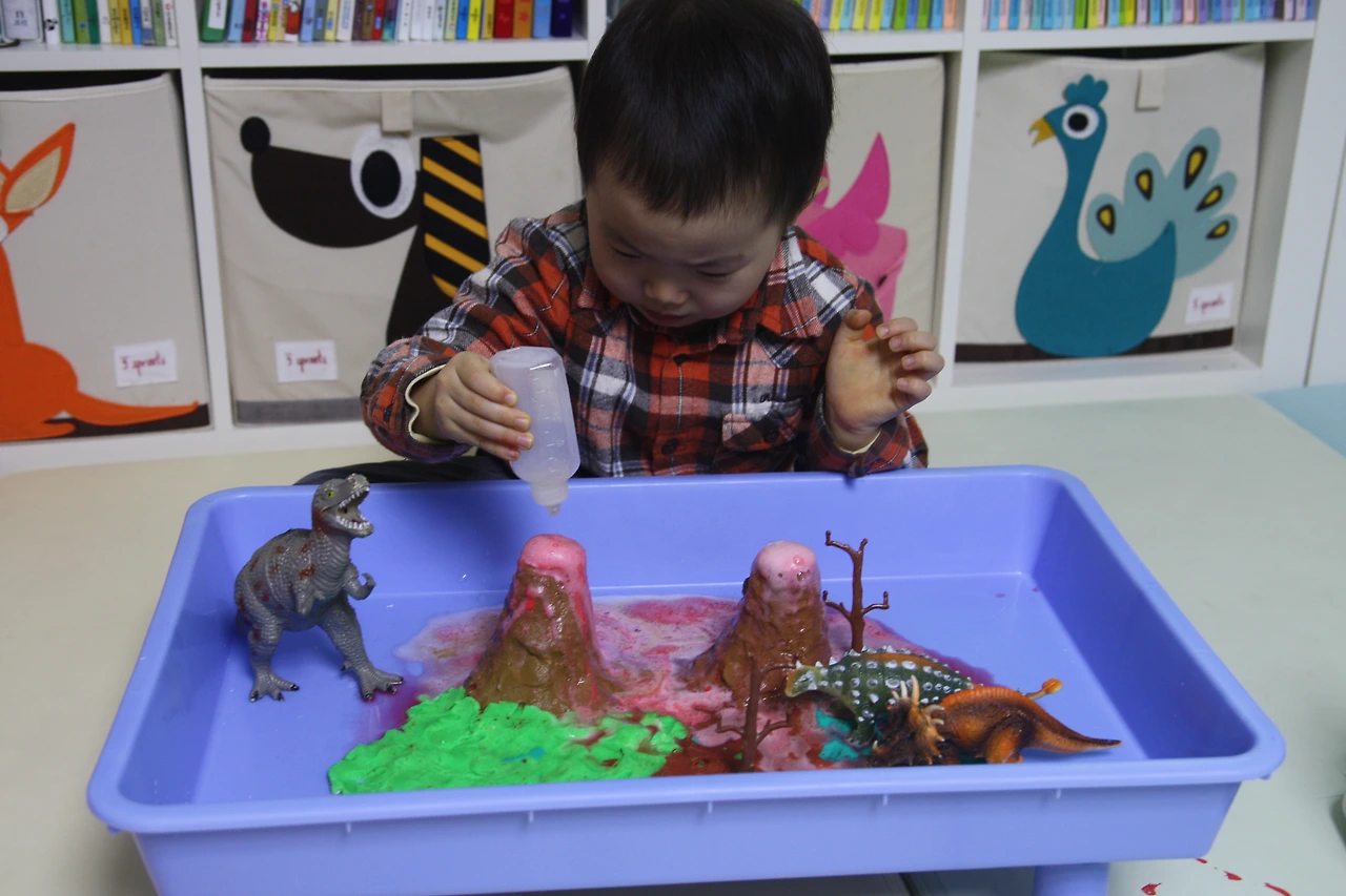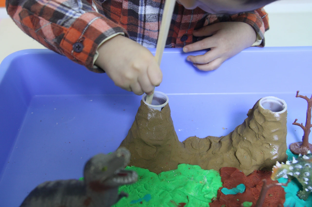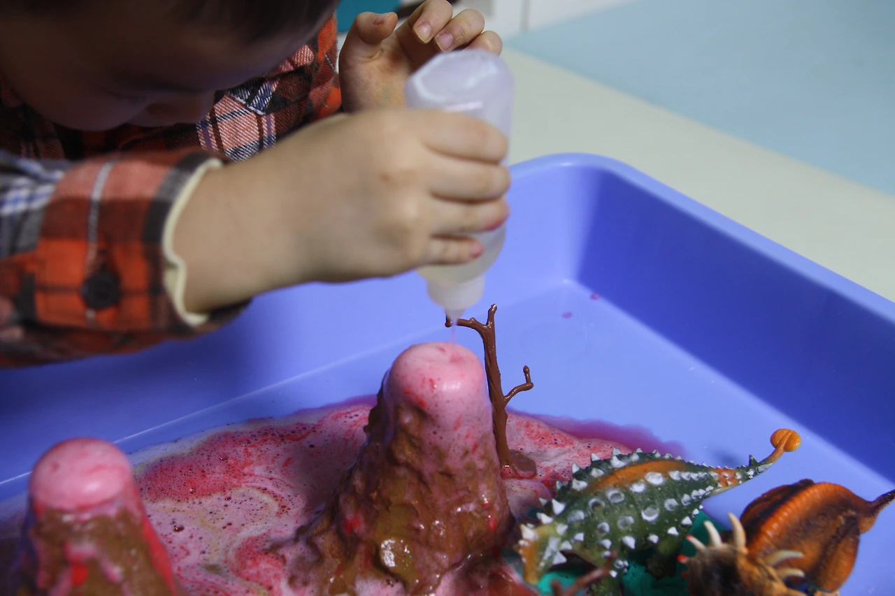 그럴듯한 화산 폭발을 위해 빨간색 물감을 넣어줍니다.