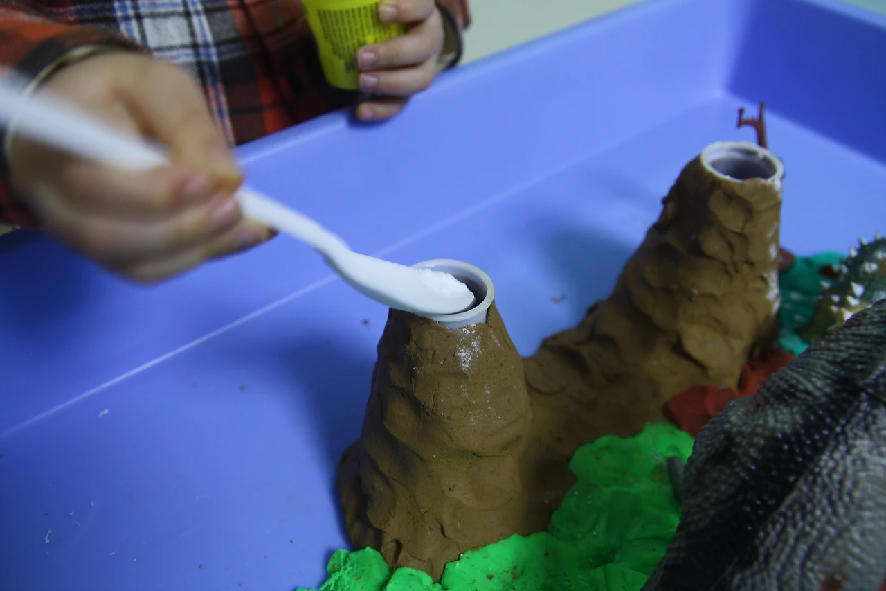 화산 입구에 베이킹 소다 1T을 넣어 줍니다.