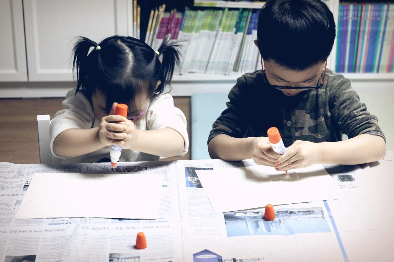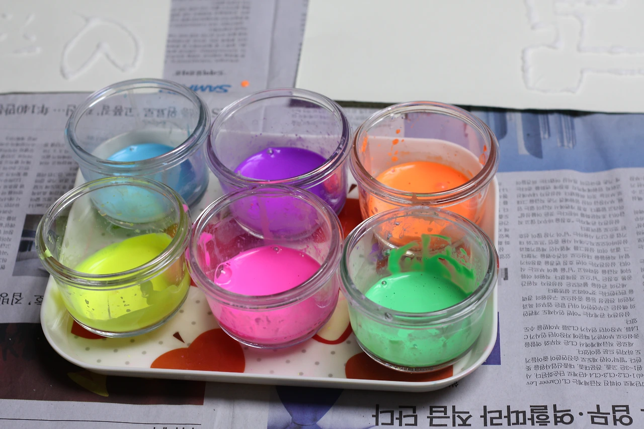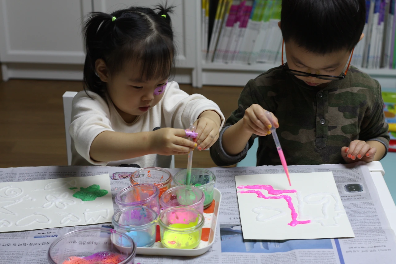 쟁반 위에 목공풀로 그림 그림을 올려놓고