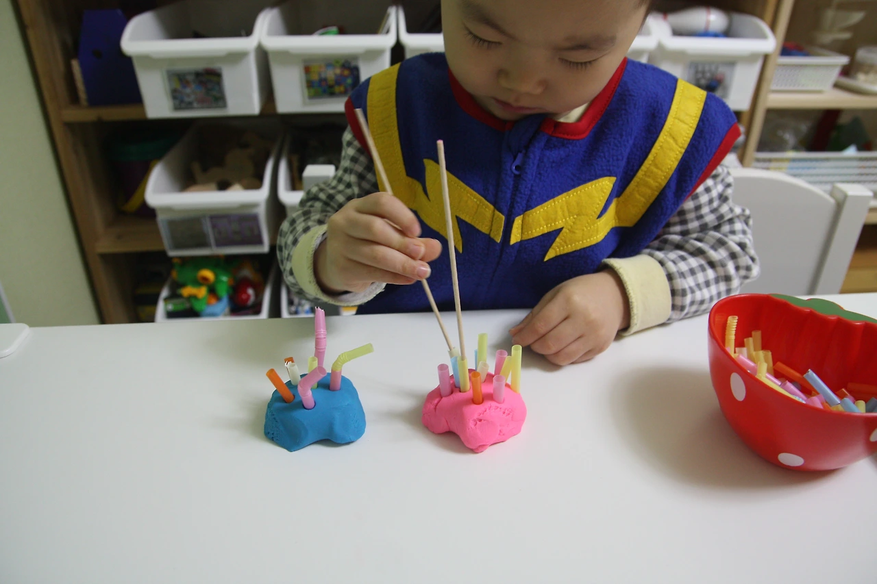 산적꼬치에 미리 잘라둔 빨대를 계속 꽂는 놀이예요~