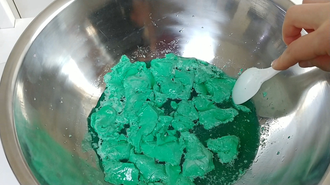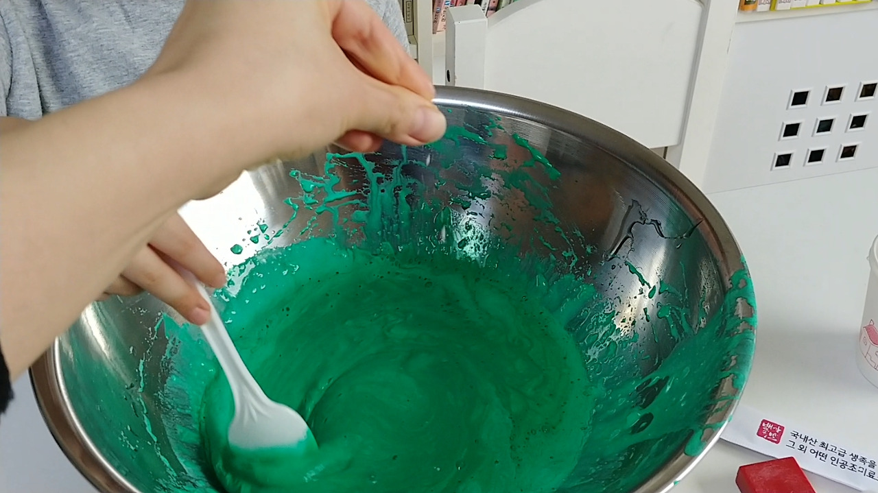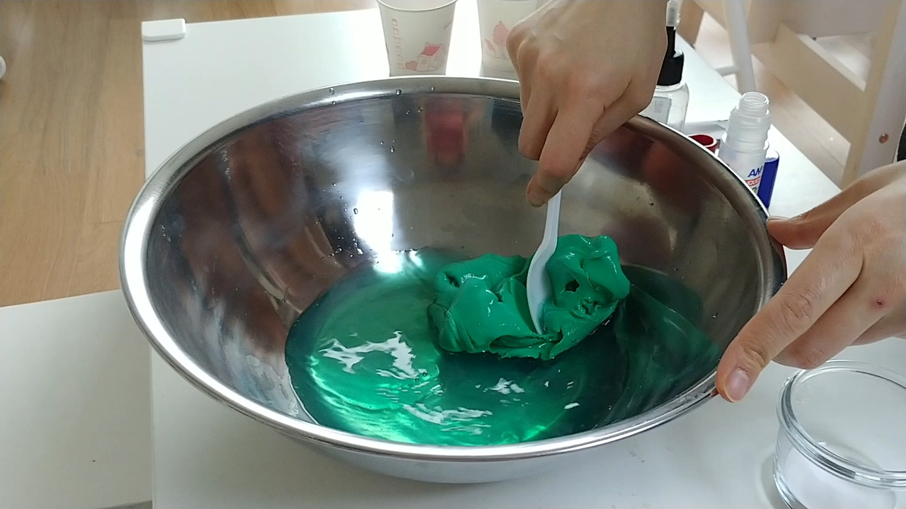 잘 반죽이 되면 그릇과 손에서 액체괴물이 잘 떨어집니다.