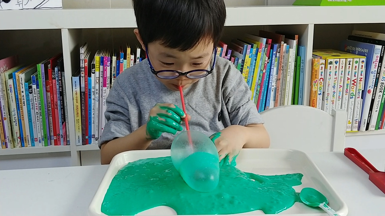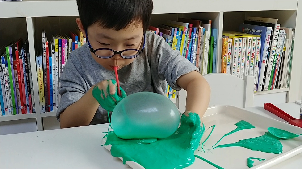 액체 괴물에 빨대를 꽂고 바람을 불어넣으면~~~액괴 풍선~~~후~ 후~