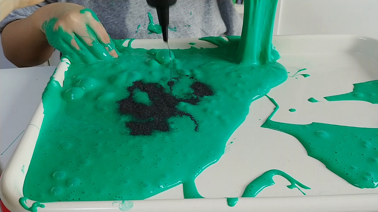 액체 괴물에 철가루를 넎어서 반죽합니다.