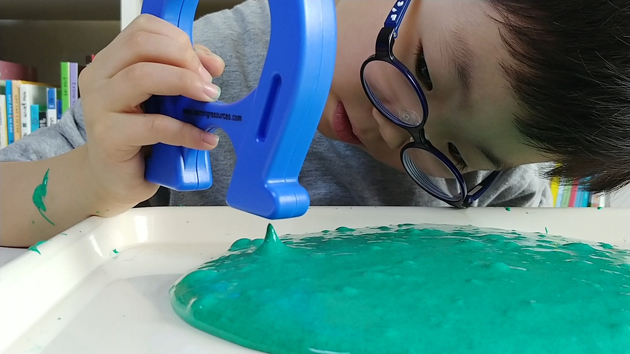 자석을 가까이 하면액체 괴물이 자석 쪽으로 움직이며 모양을 변하는 모습을 관찰할 수 있습니다.