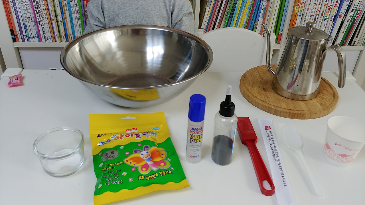 아이클레이 50g, 뜨거운 물은 종이컵으노 1.5컵, PVA 물풀 50ml.