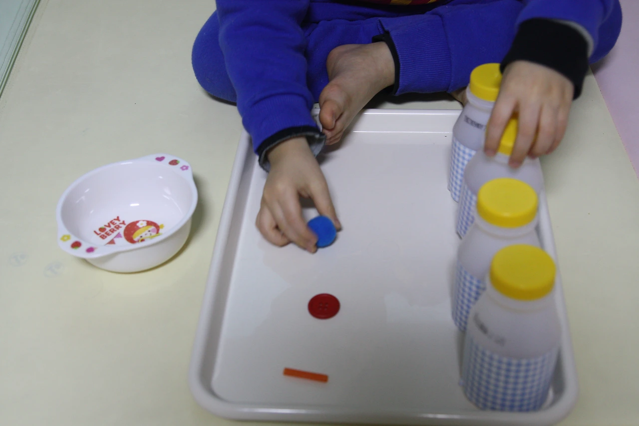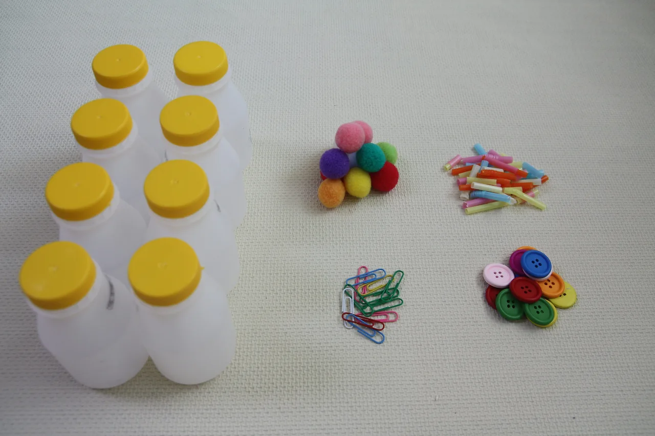 빨대, 단추, 색솜, 클립을 작은 바구니에 담아주고