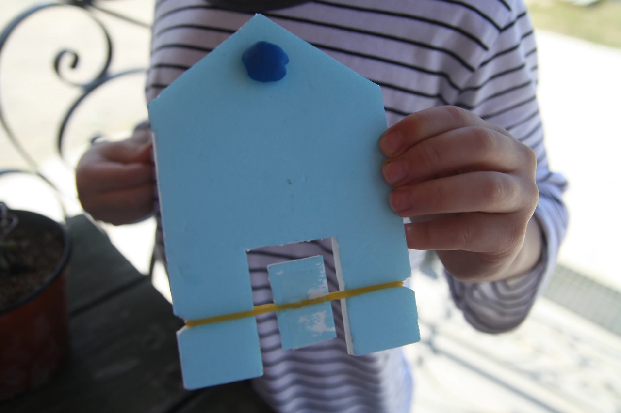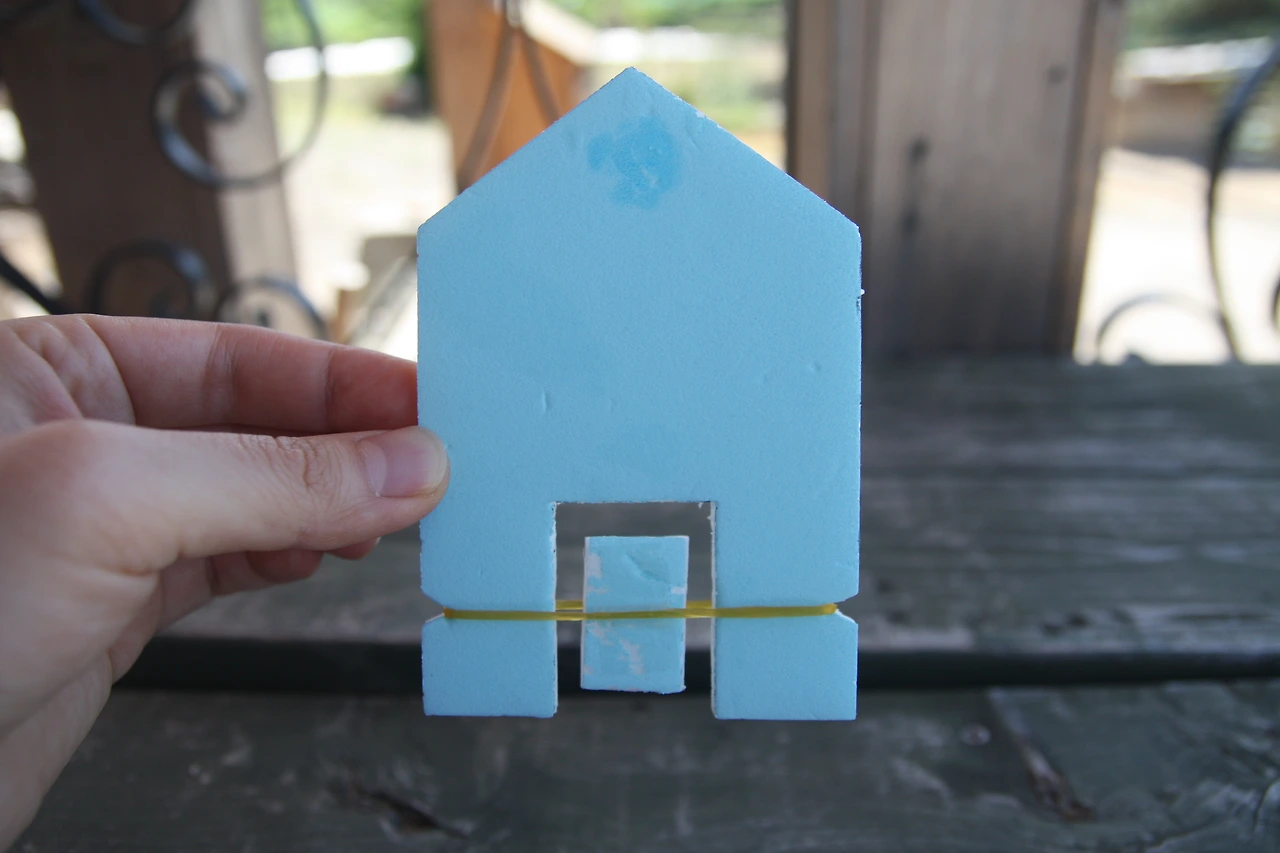 중간의 우드락 조각은 접착 테이프를 붙여서 고무줄에 고정시킵니다.