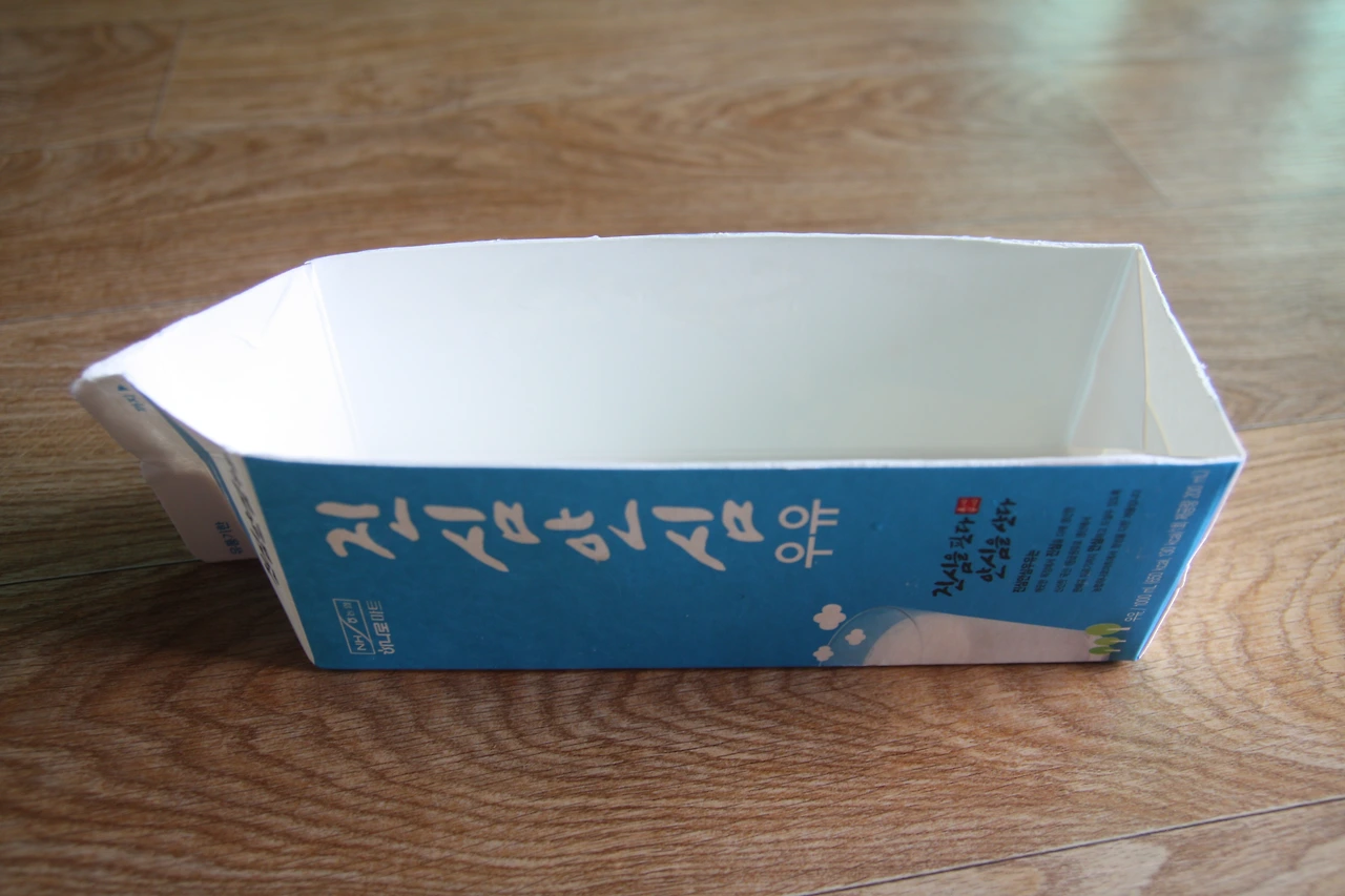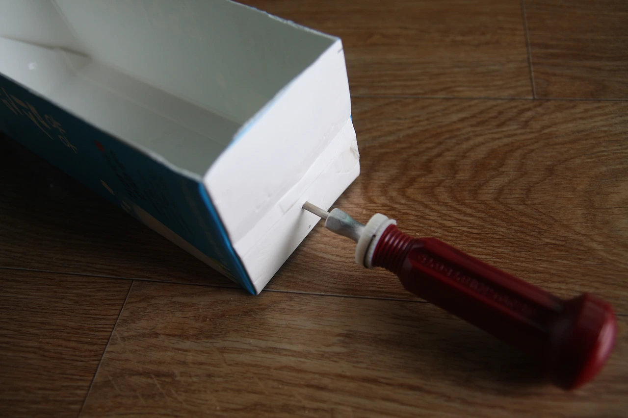 우유갑 바닥에 송곳으로 구멍을 뚫습니다.