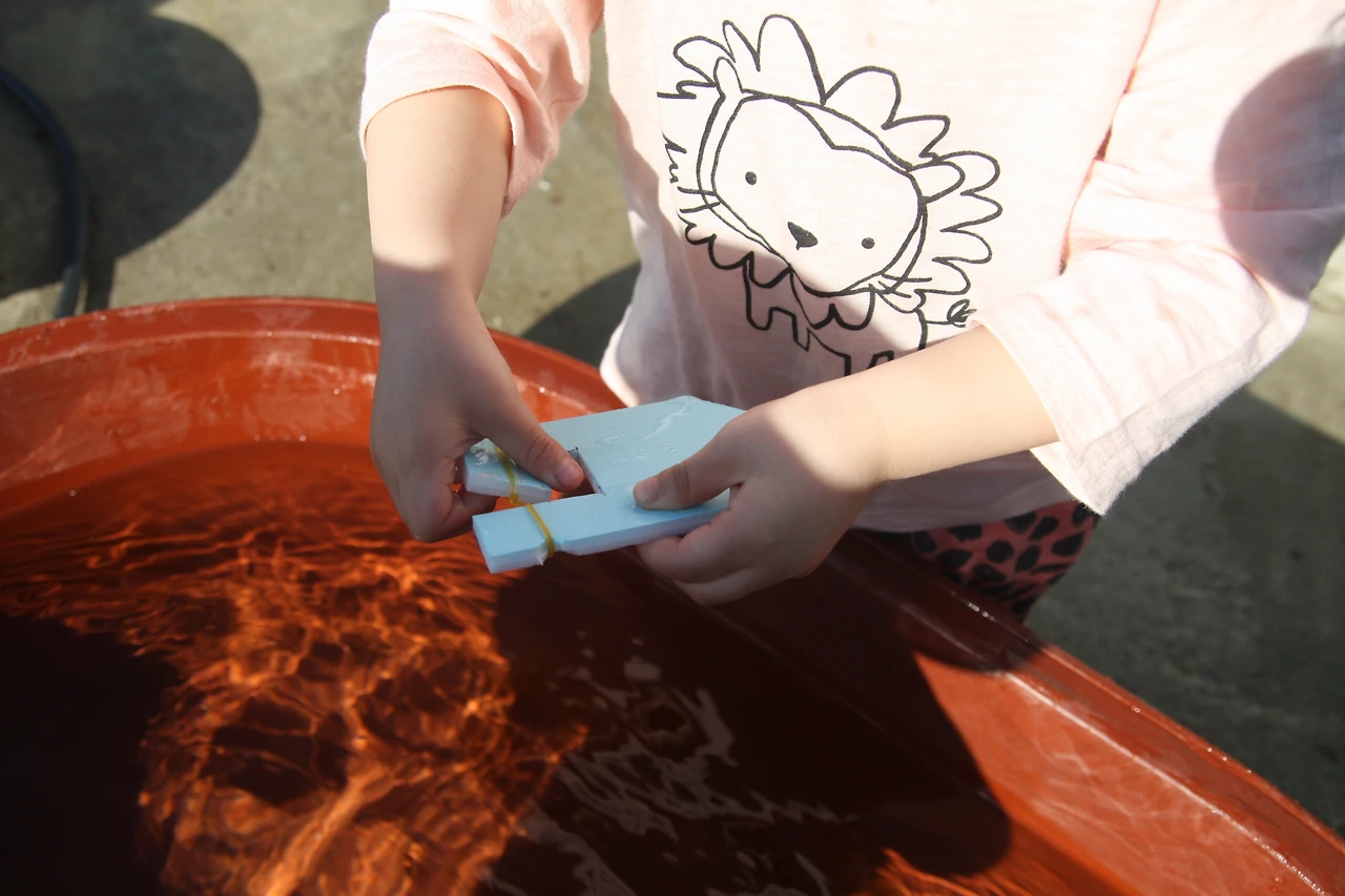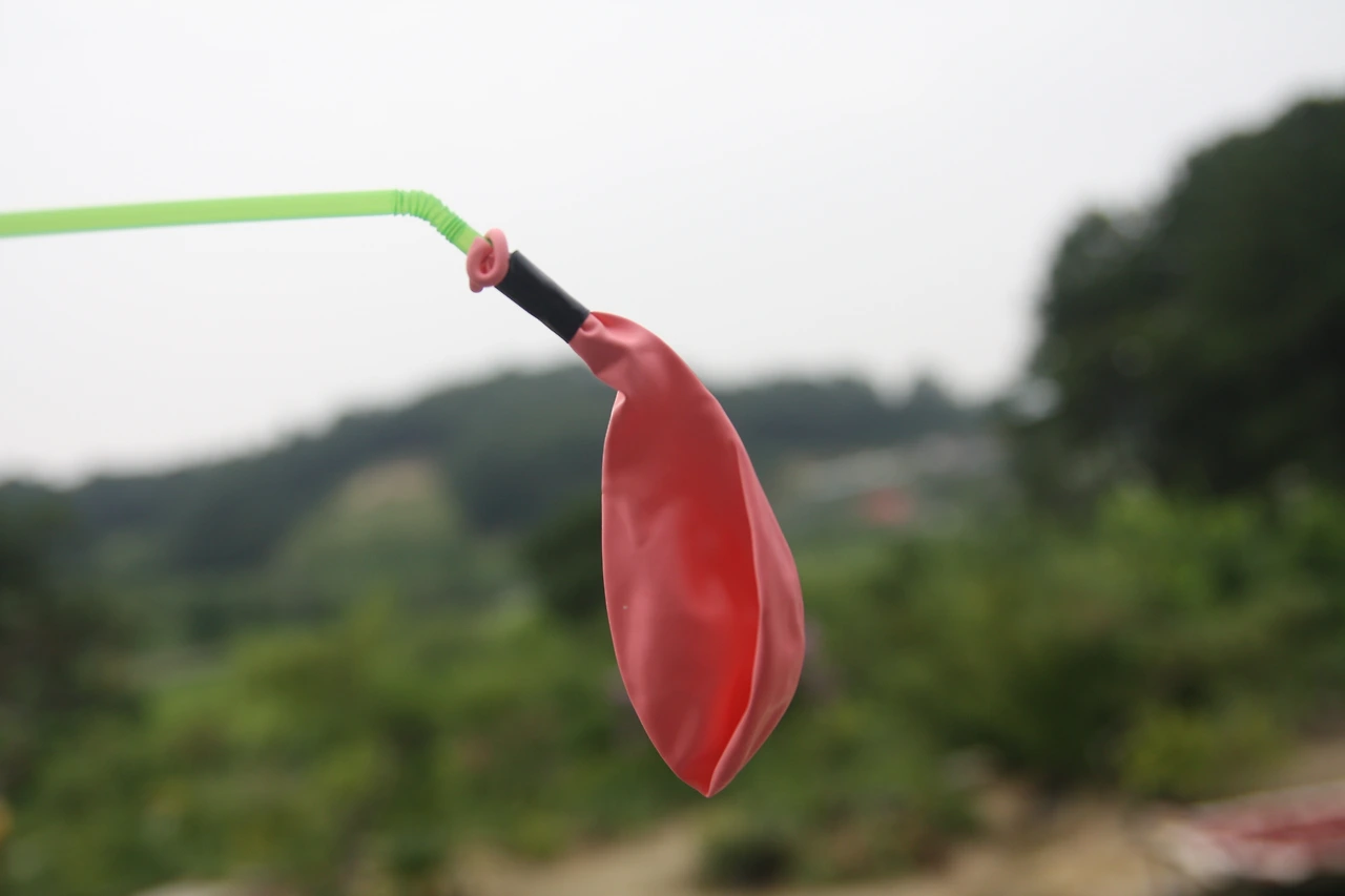 빨대 끝을 손으로 꽉 잡고 풍선 배를 물에 띄웁니다.