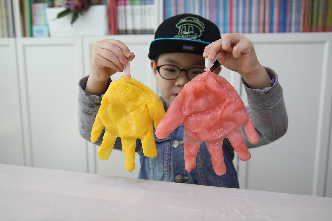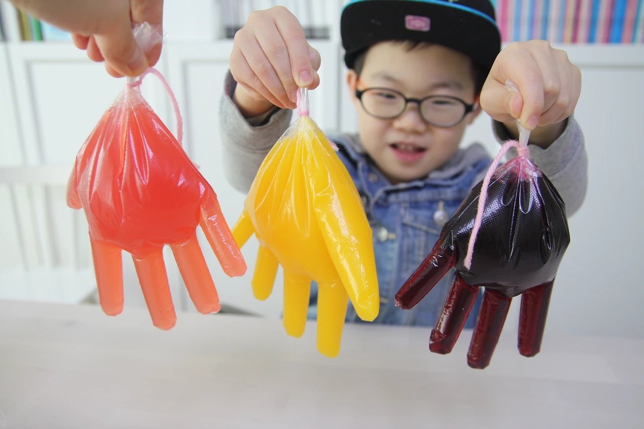 비닐로 된 위생장갑에 좋아하는 주스나 음료수를 담습니다.