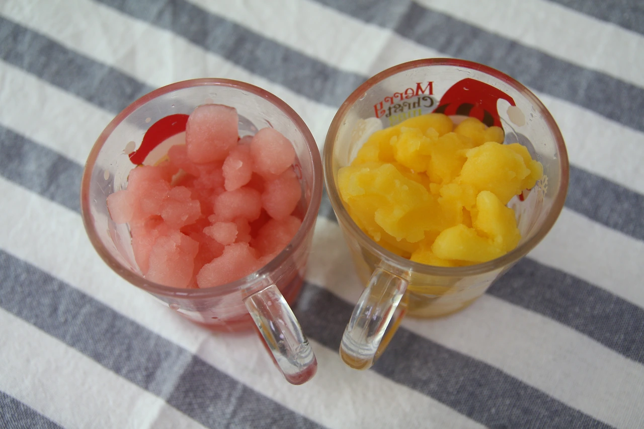 다홍, 노랑, 보라~ 각기 다른 색깔(종류)의 음료를 사용했어요.