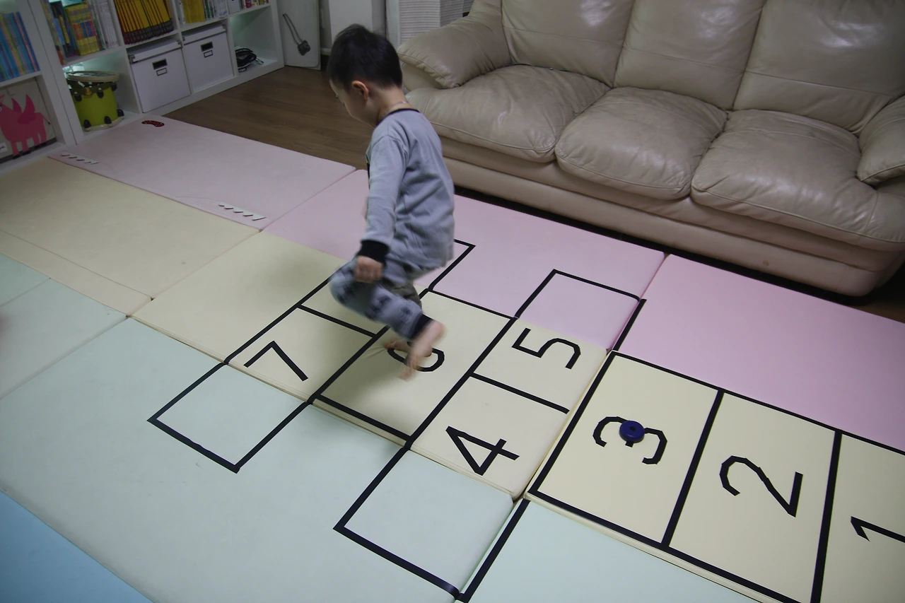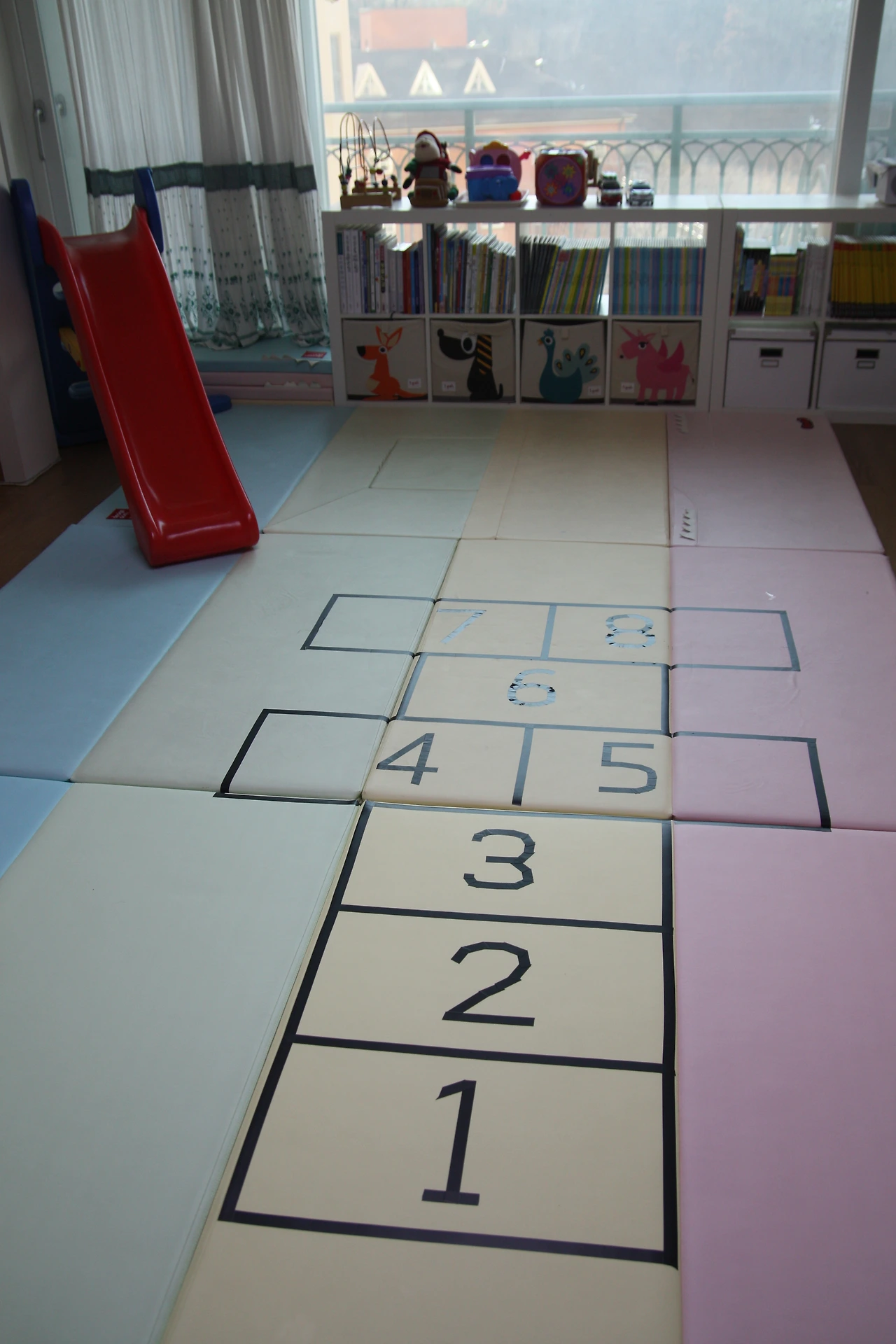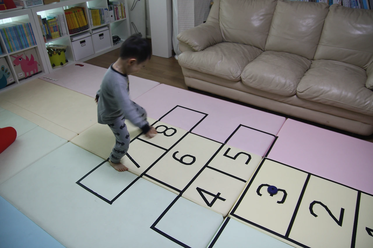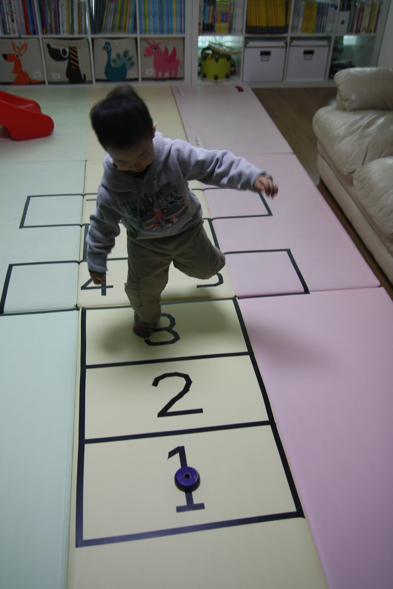 거실 바닥이 아닌 놀이매트 위에 사방치기 모양을 만들어서 놀이했어요~