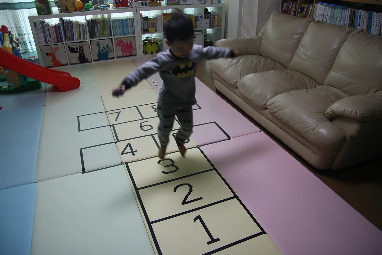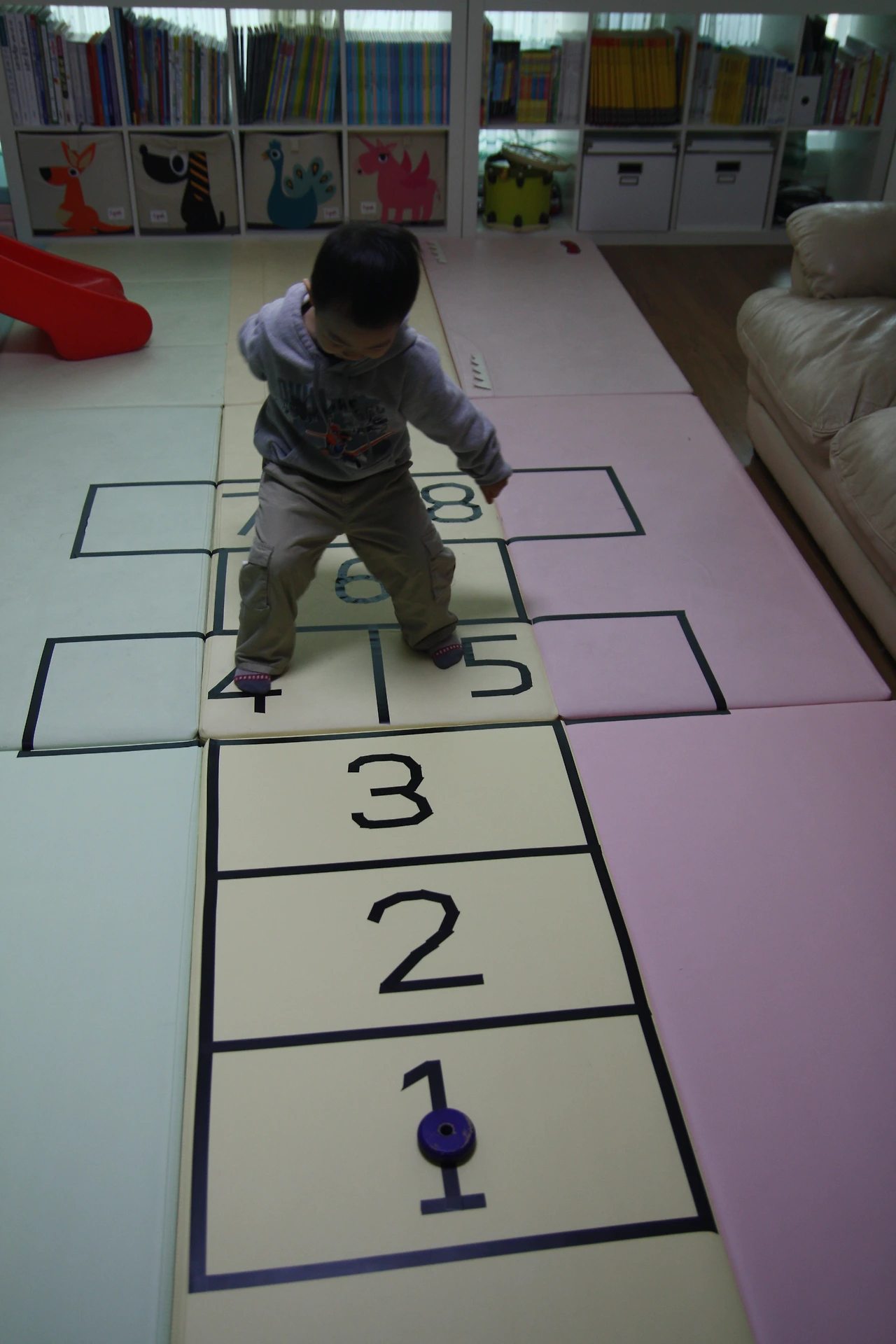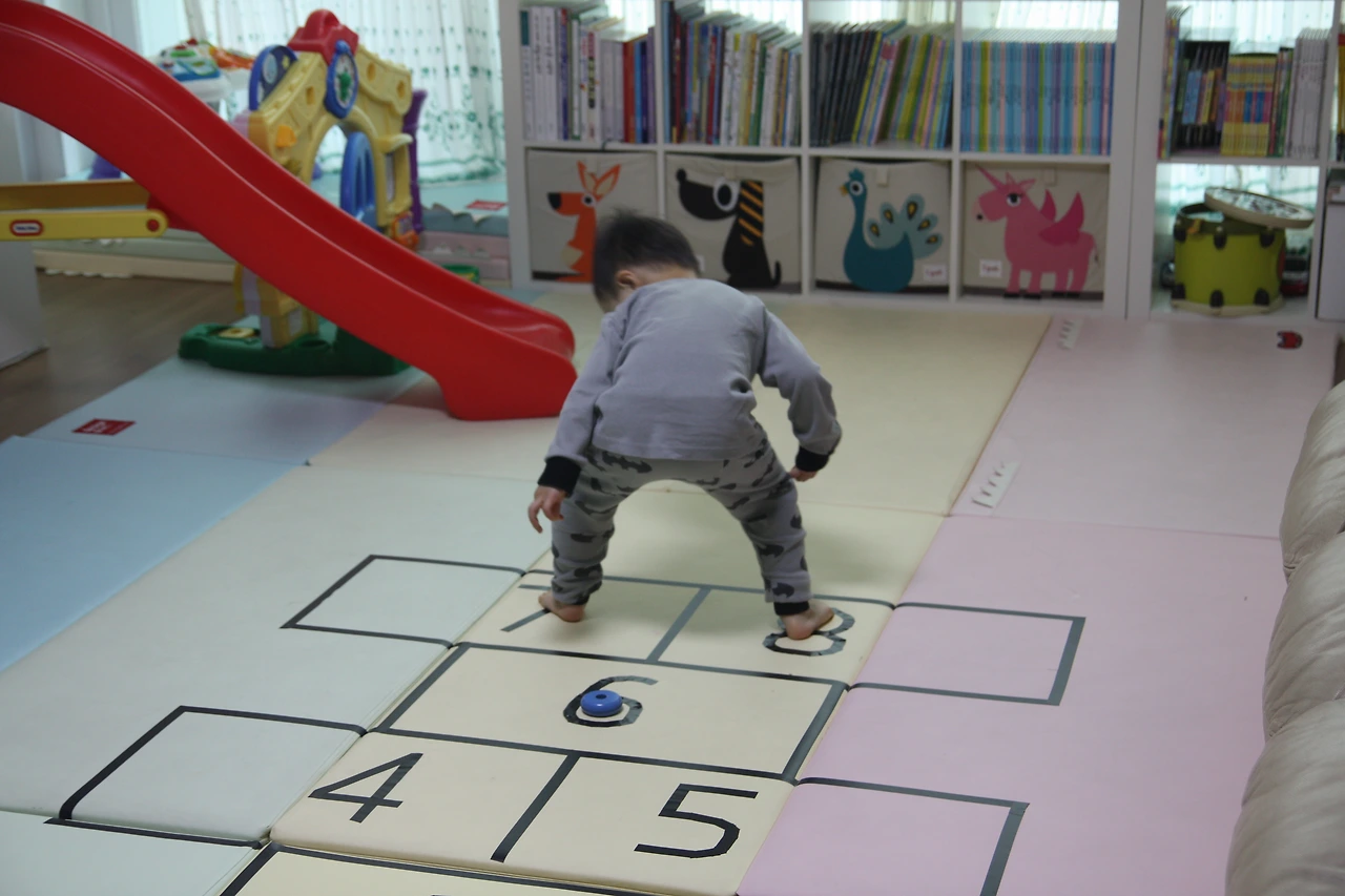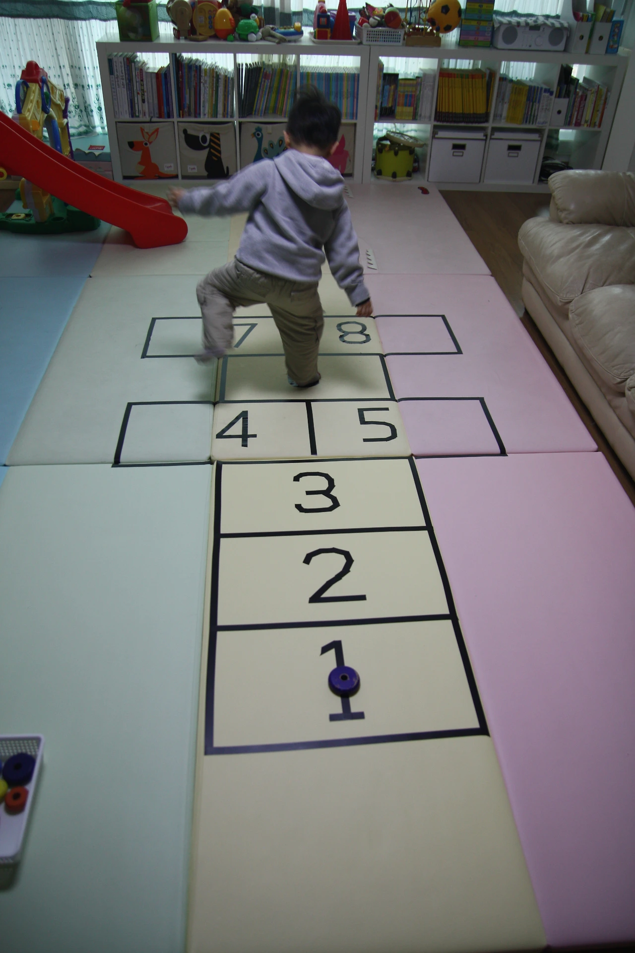 거실 바닥이 아닌 놀이매트 위에 사방치기 모양을 만들어서 놀이했어요~
