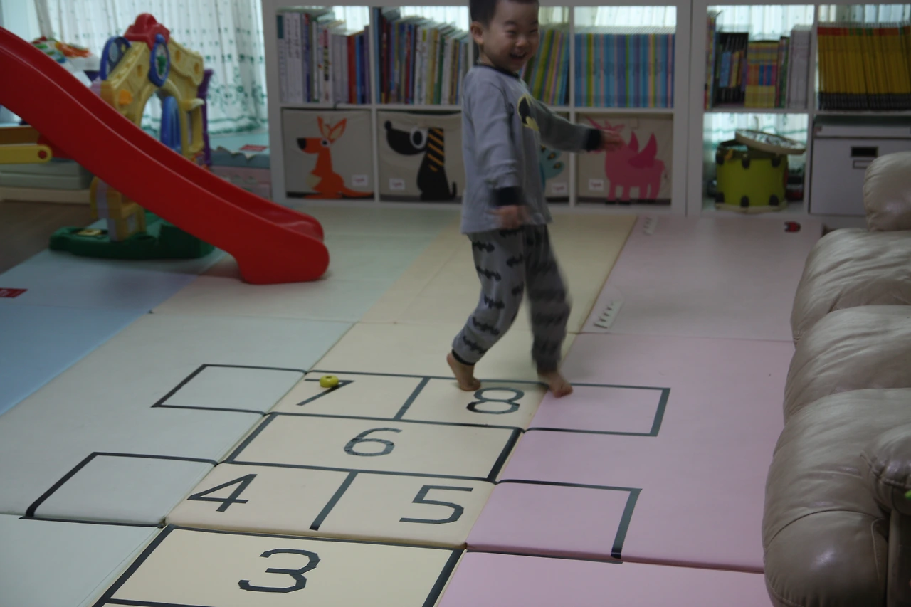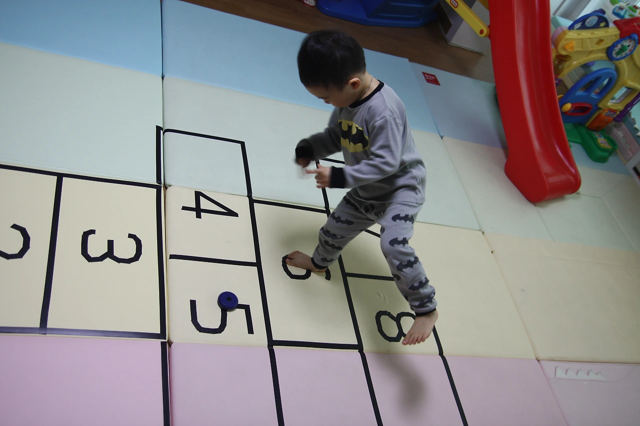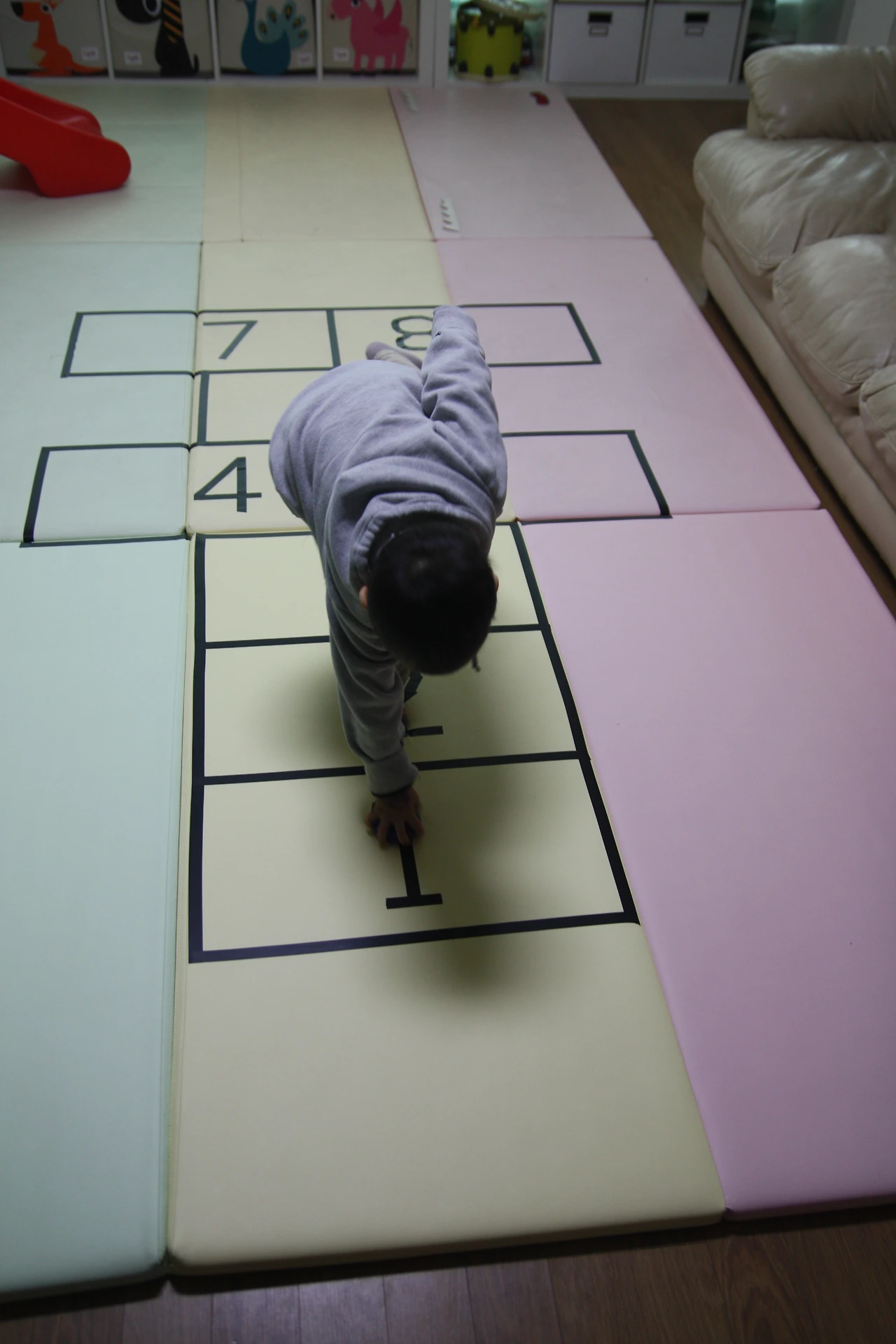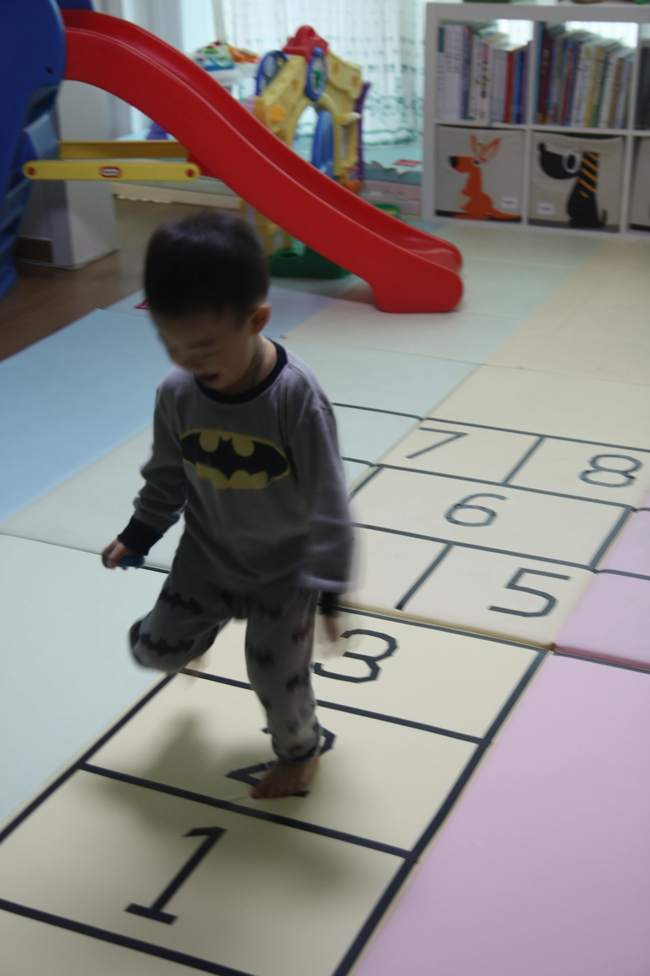 거실 바닥이 아닌 놀이매트 위에 사방치기 모양을 만들어서 놀이했어요~