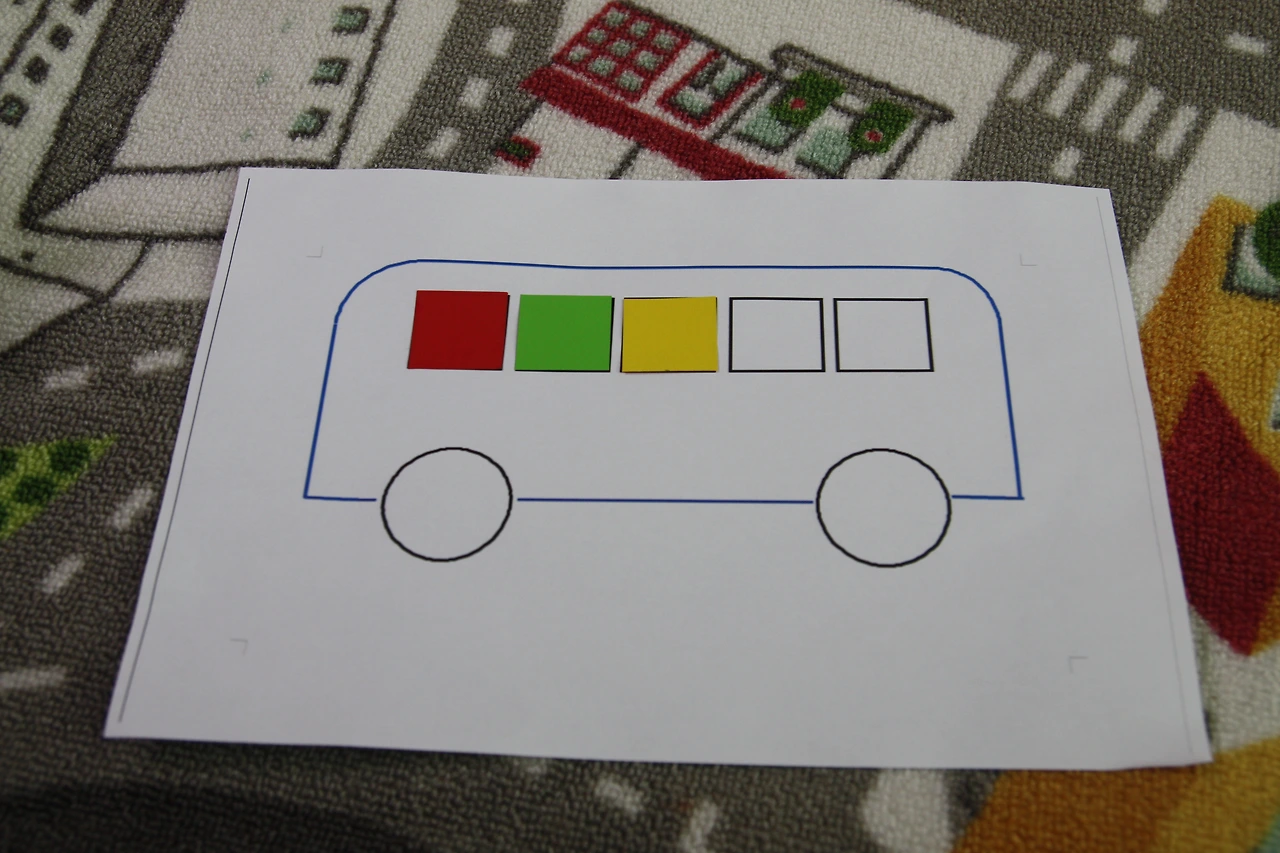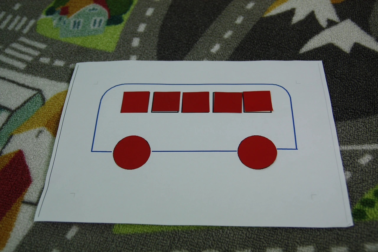 네모와 동그라미 안에 빨간색 색종이만 붙여서 버스를 완성하더니