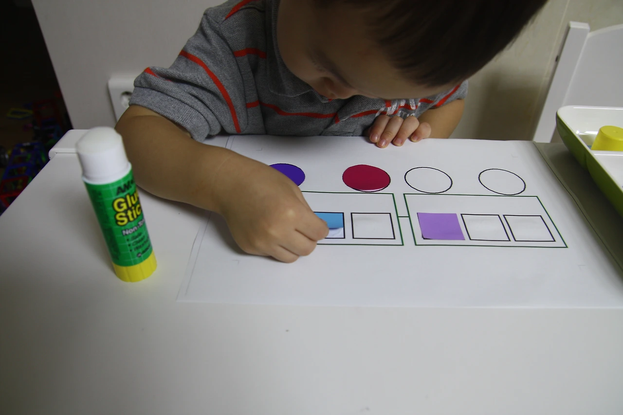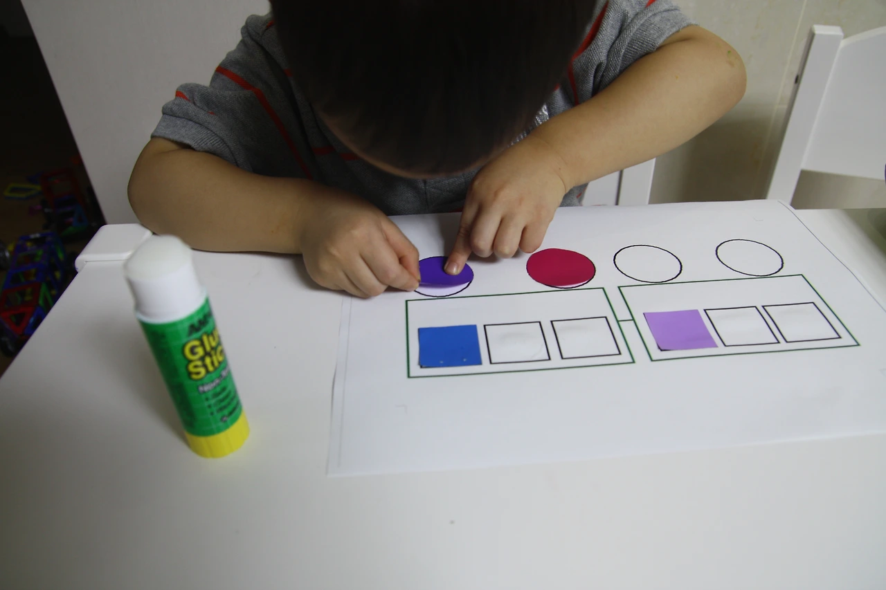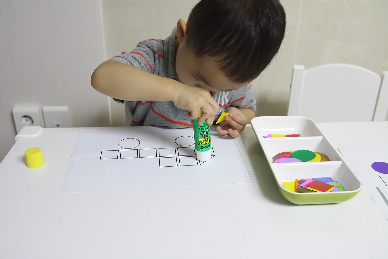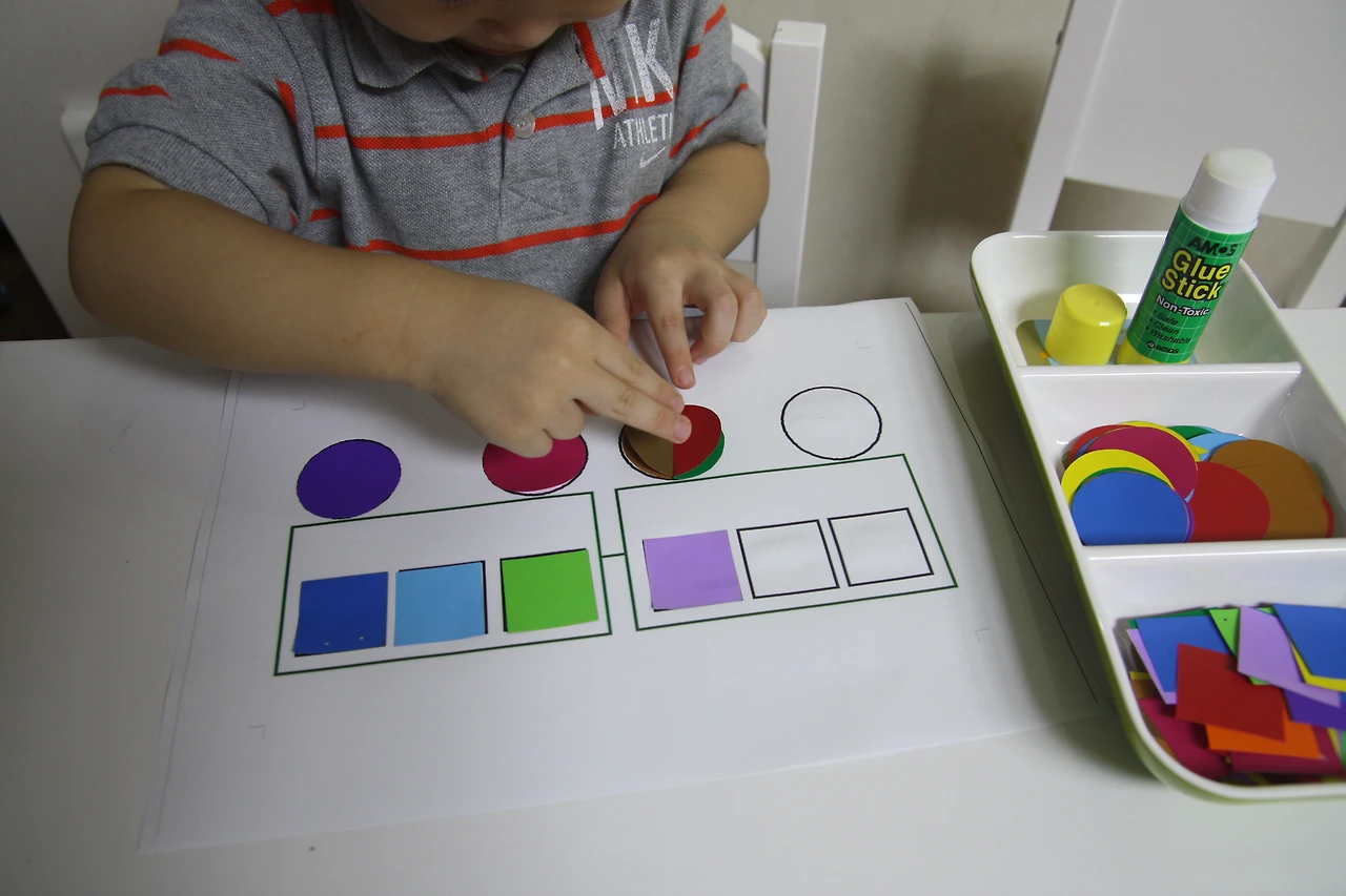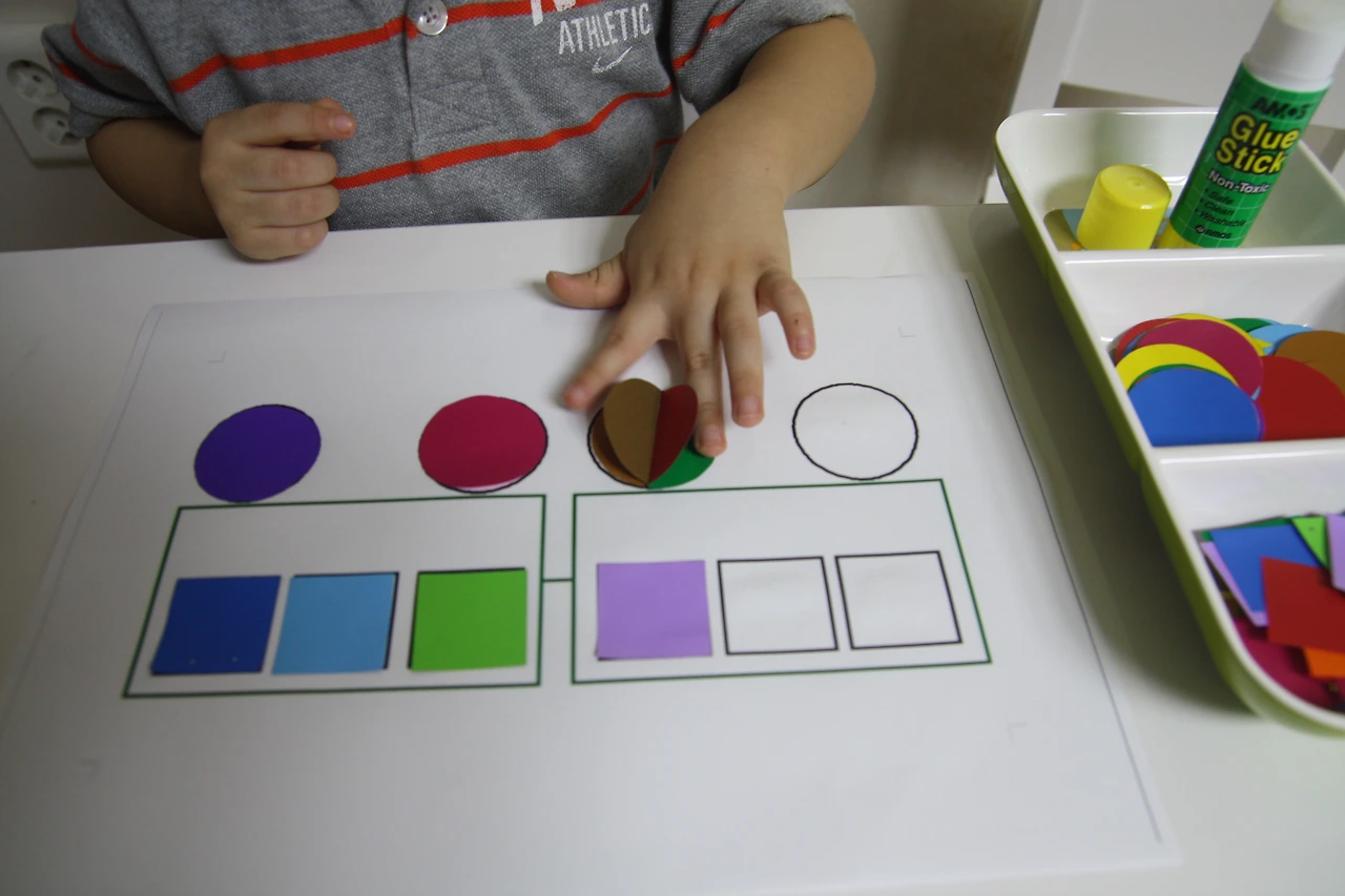 동그라미, 세모, 네모 모양으로 오려놓은 색종이, 딱풀,