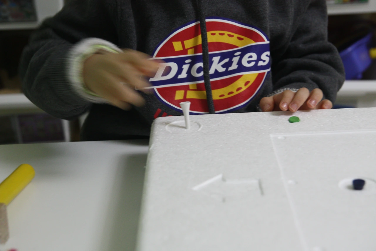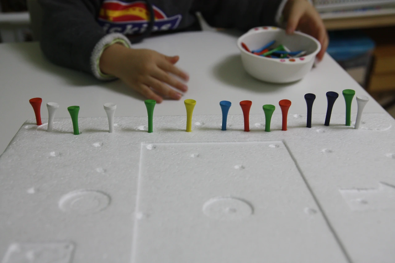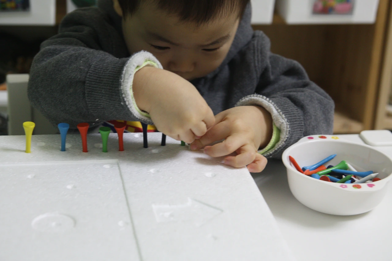 햇살이한테 못을(아이한테 활동자료 소개할 때는 '골프티'란 단어가 어려울 것 같아서 '못'이라고 이야기했어요.) 기차처럼 길게~ 손으로 꽂아 달라고 했습니다.