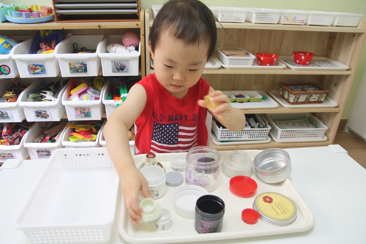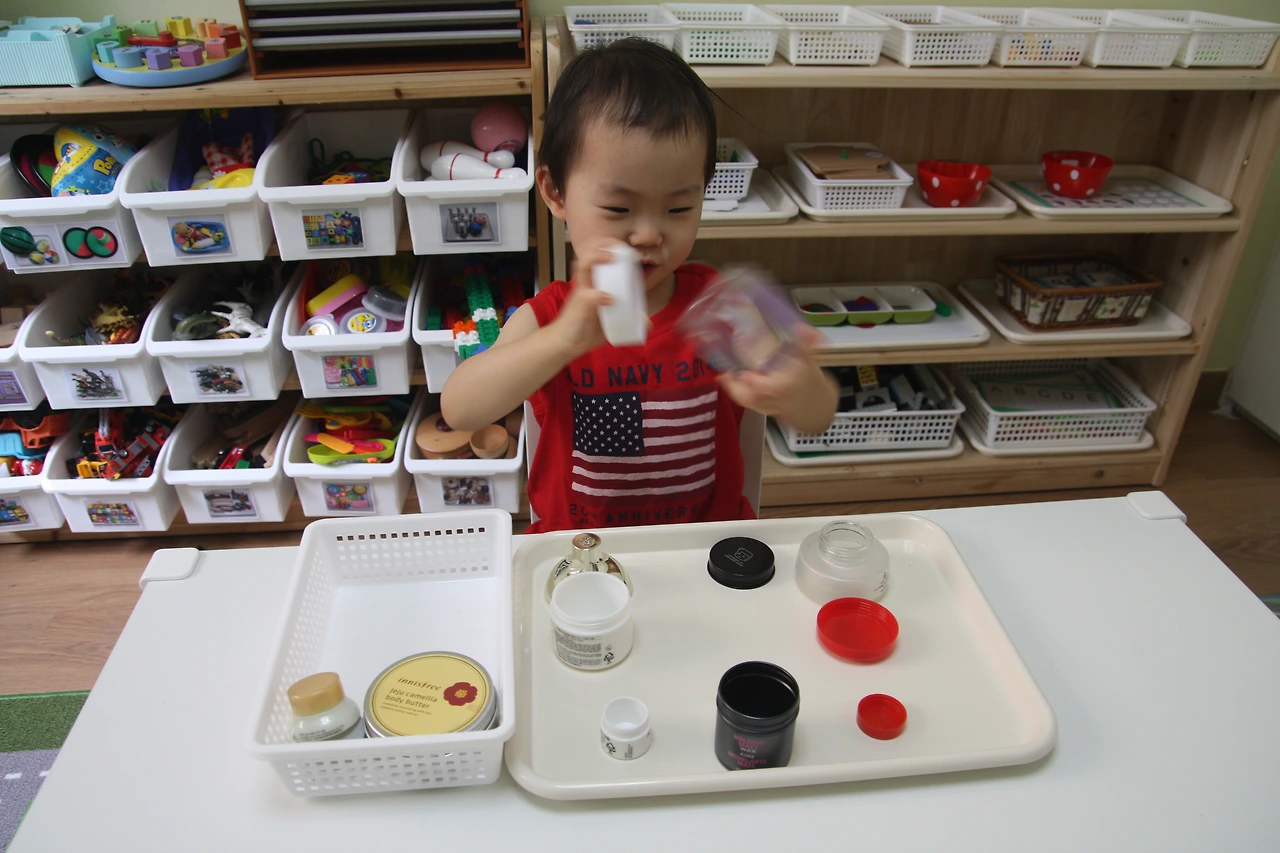 엄마의 화장품 용기가 아주 좋은 놀잇감이 되었어요.