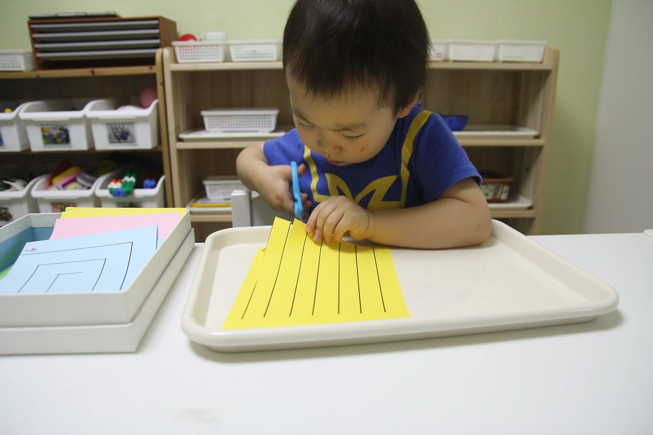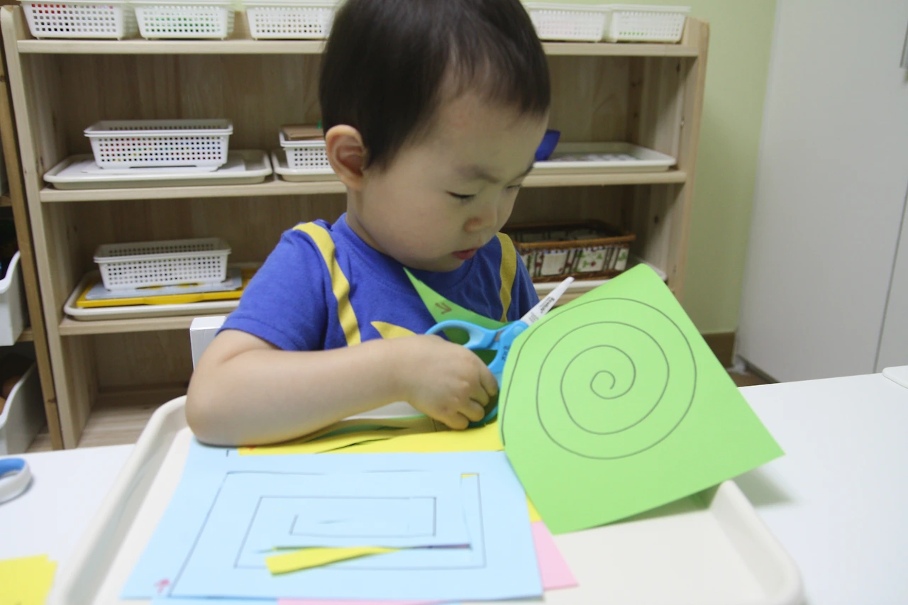 종이에 그려진 선을 따라 가위로 오리는 활동입니다.