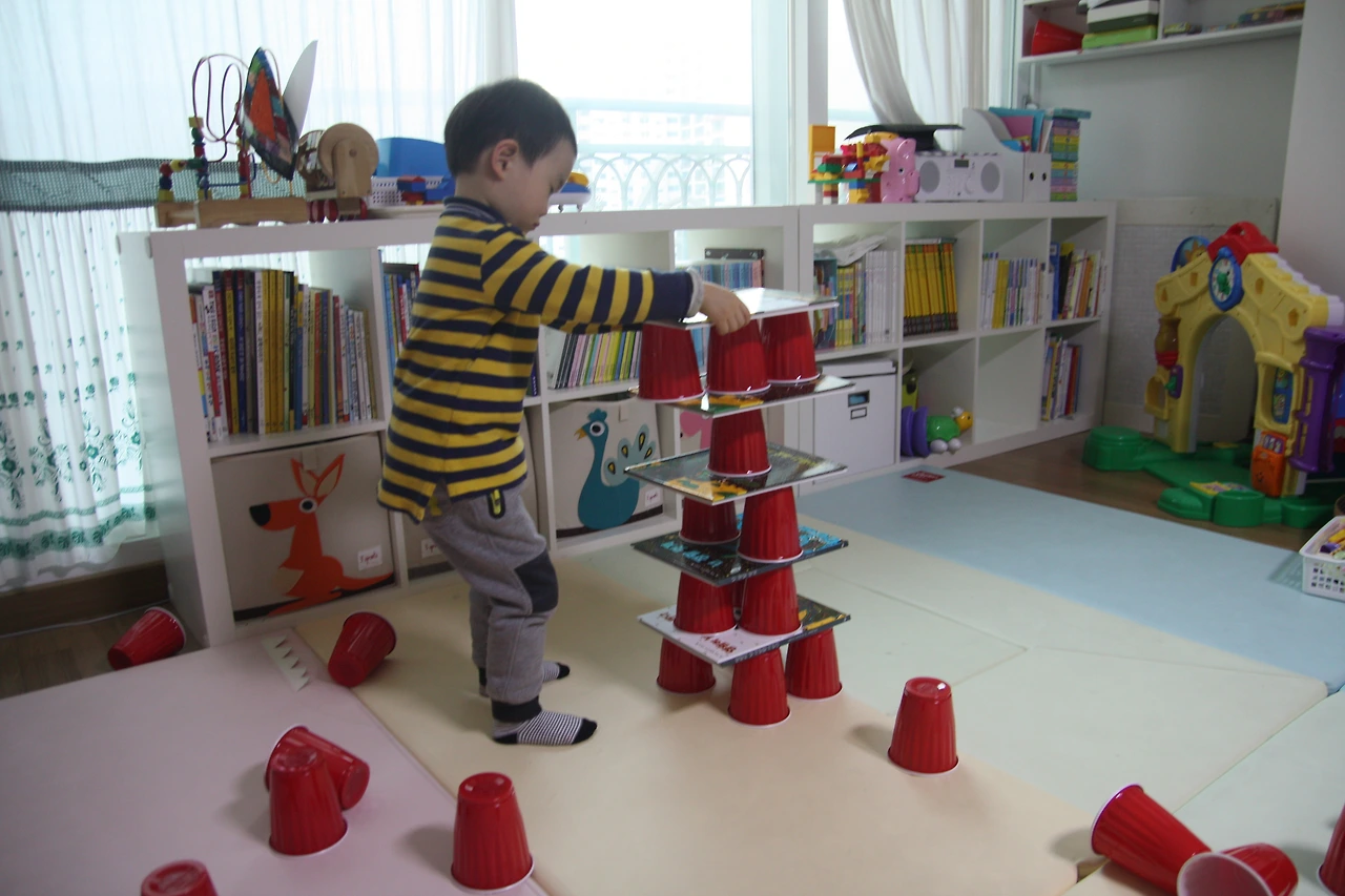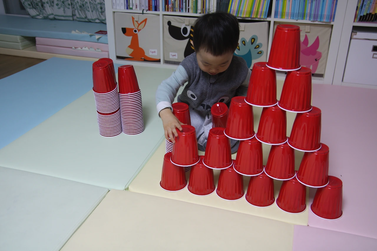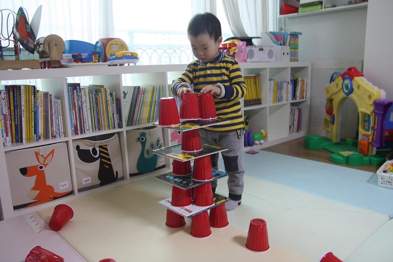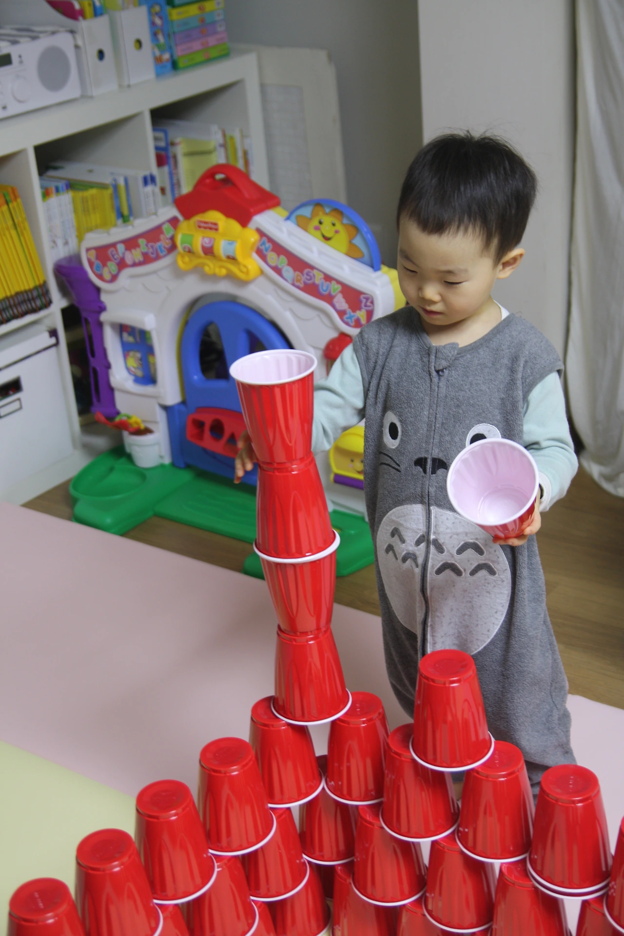 이때에도 엄마는 균형이 잘 잡히도록 종이컵을 4개씩 높으면 어떨지 제안해보았는데