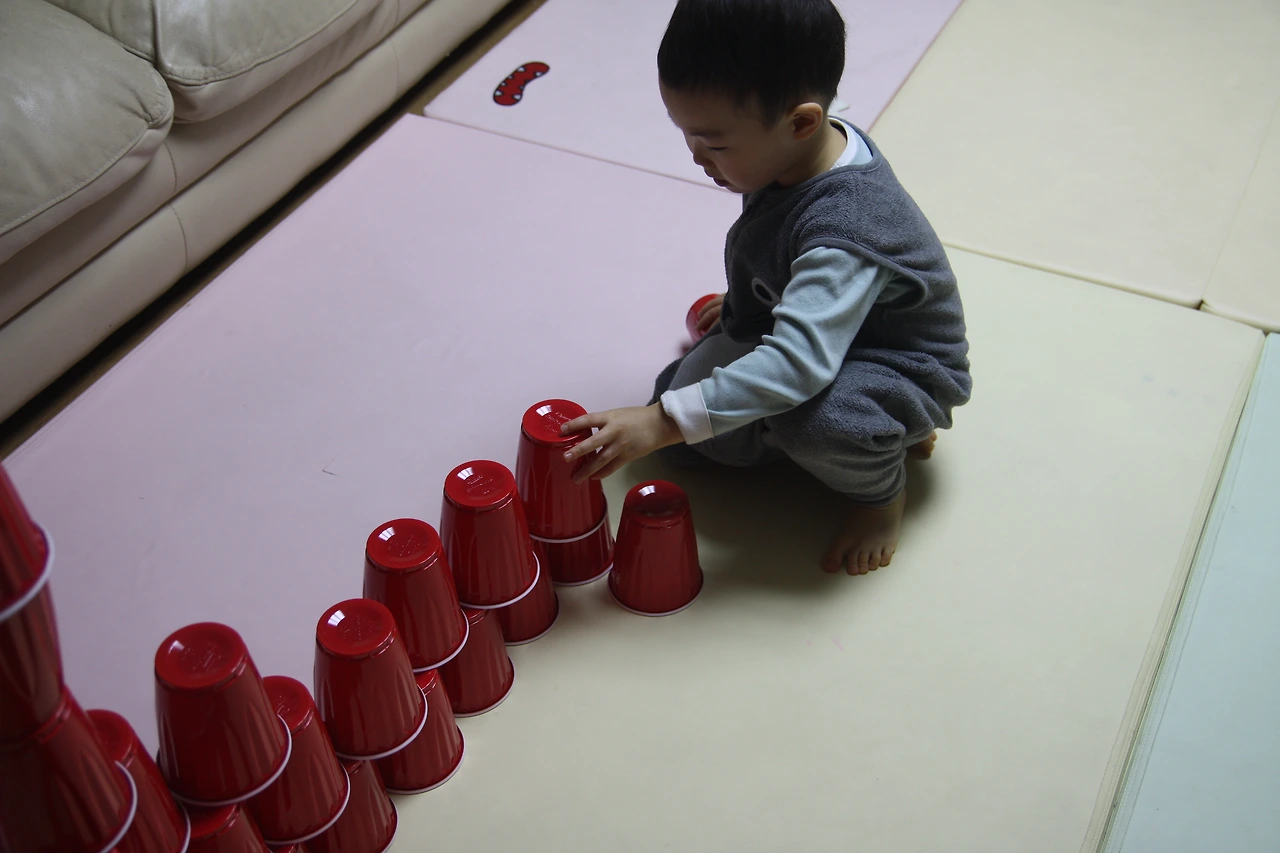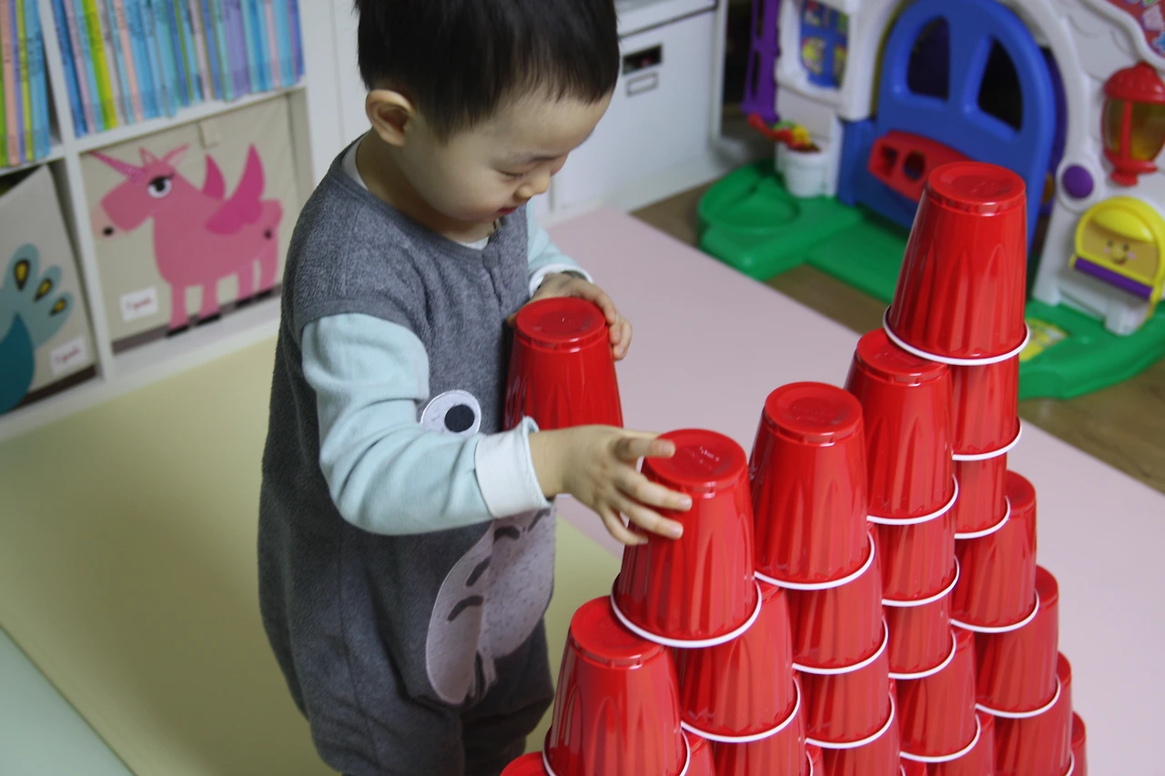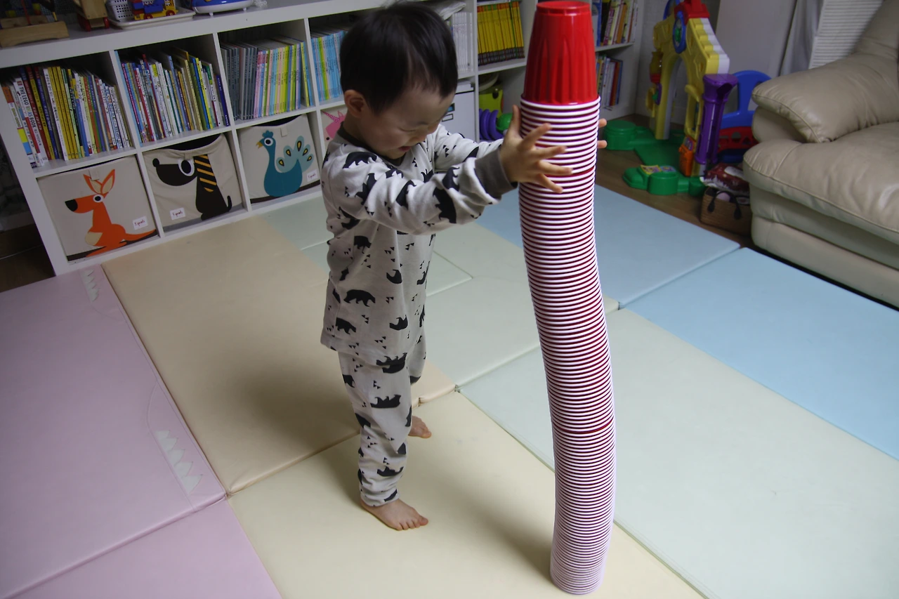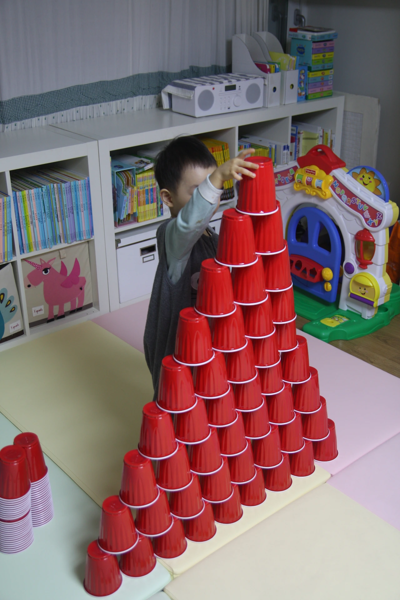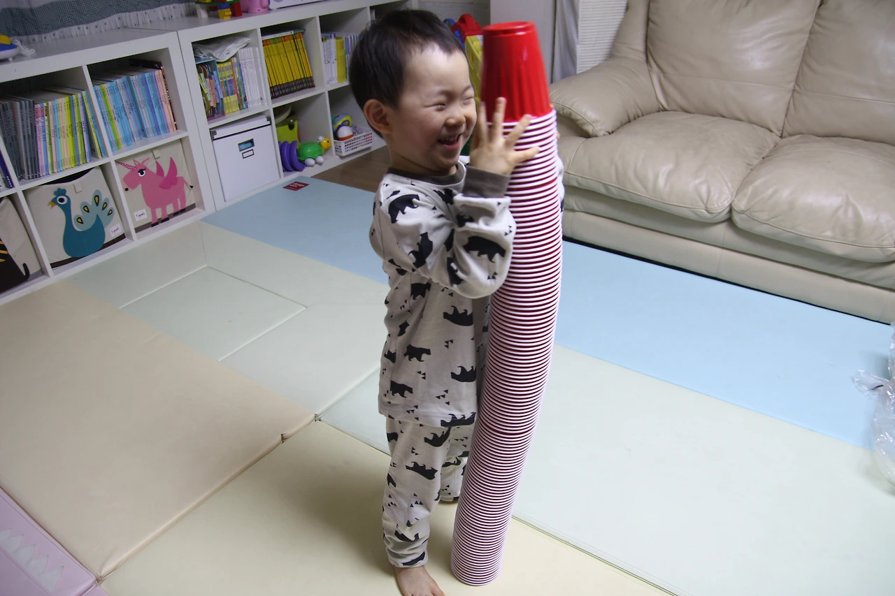 이때에도 엄마는 균형이 잘 잡히도록 종이컵을 4개씩 높으면 어떨지 제안해보았는데