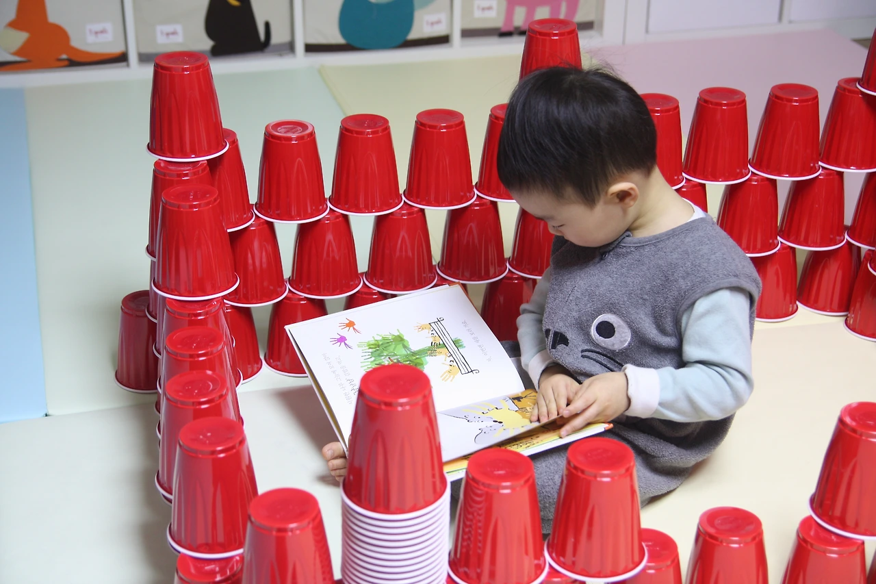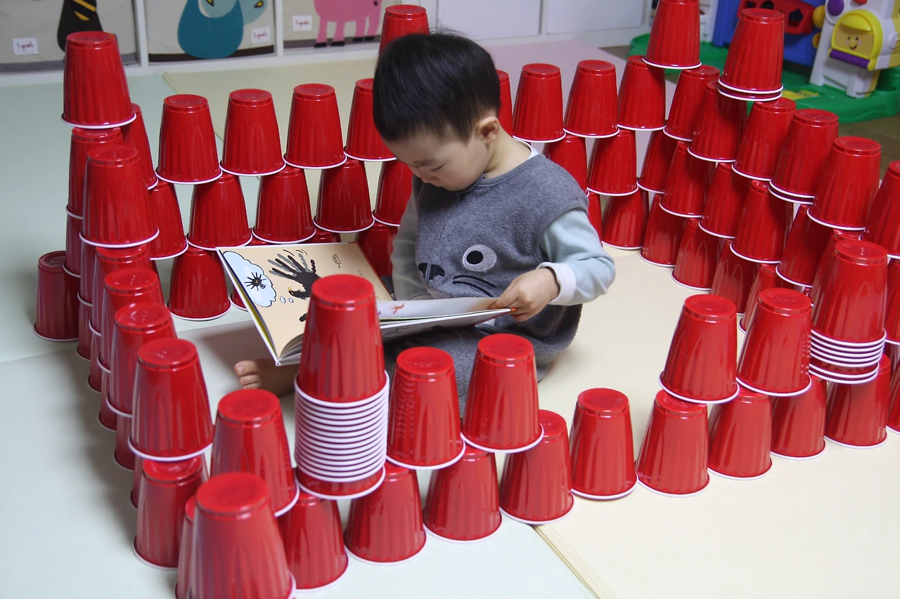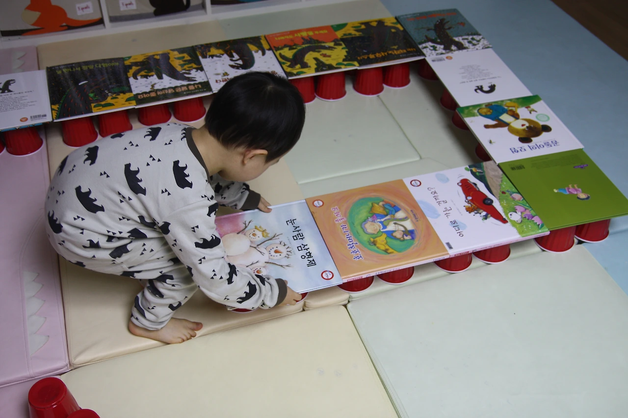 종이컵과 동화책을 번갈아 쌓으면서 탑 쌓기.