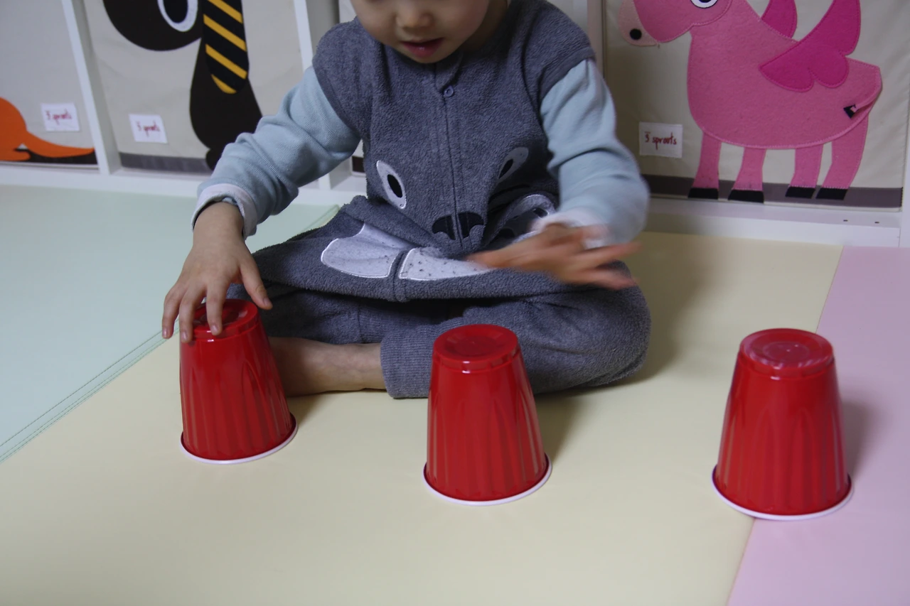 세 개의 종이컵을 마구마구 섞어주며 종이컵의 위치를 바꾸어 줍니다~