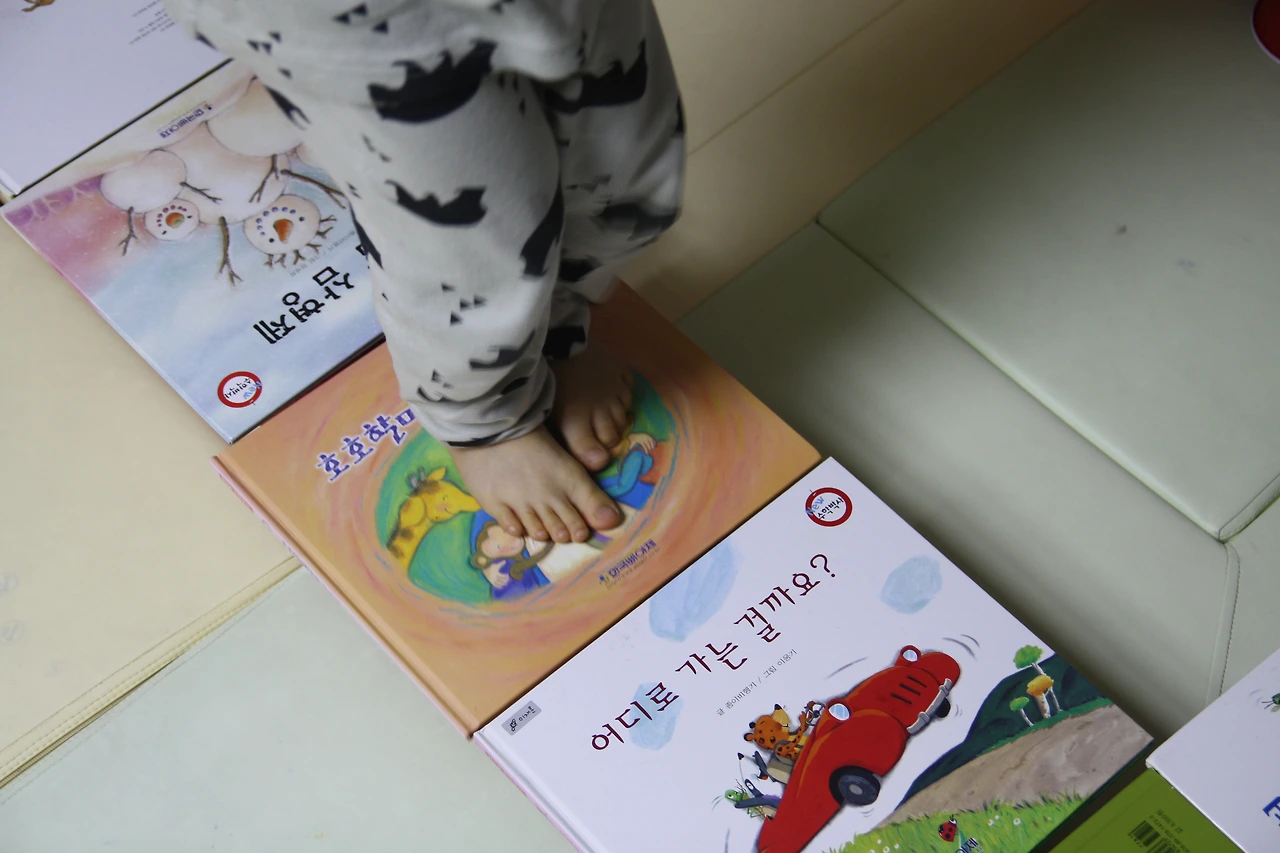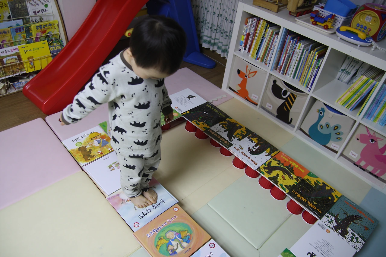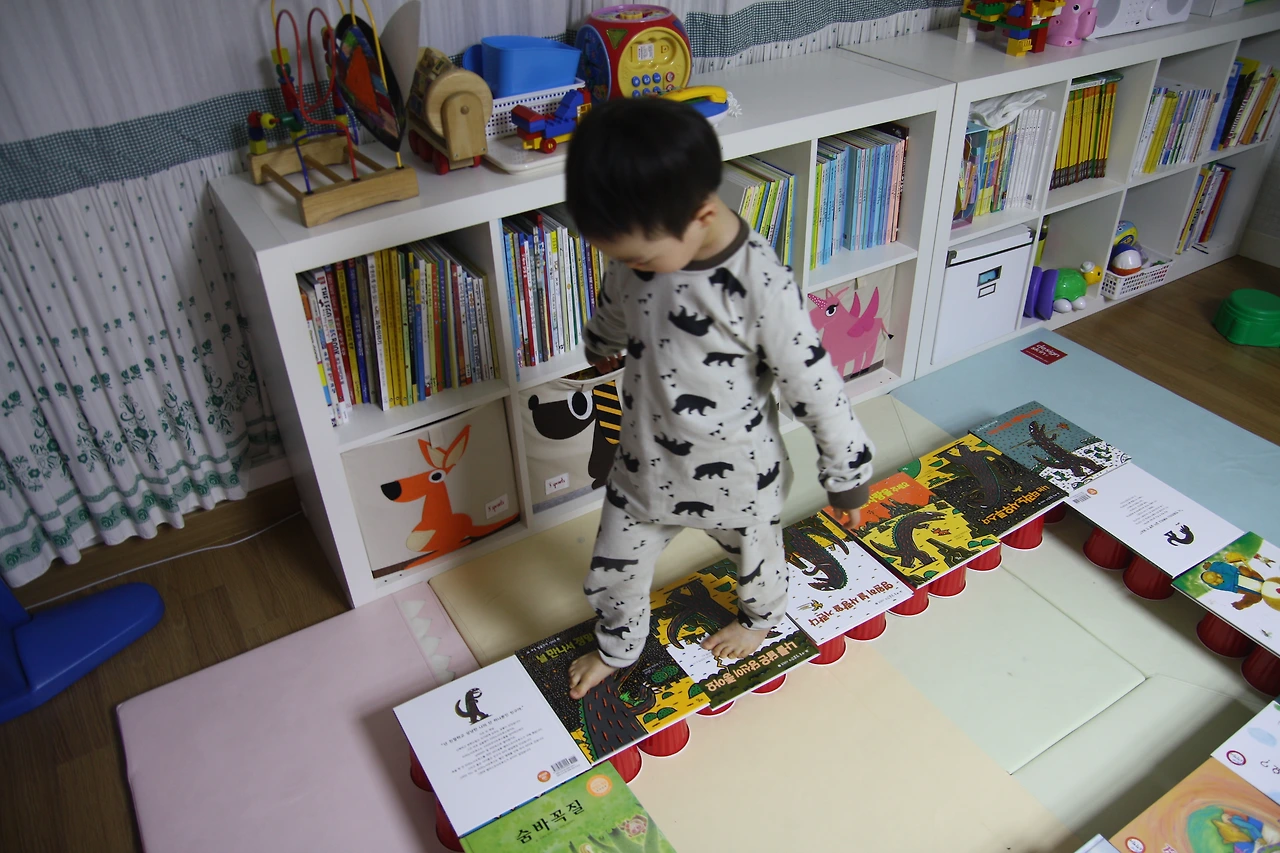 발을 디딜 때에는 동화책의 가운데를 밟습니다.