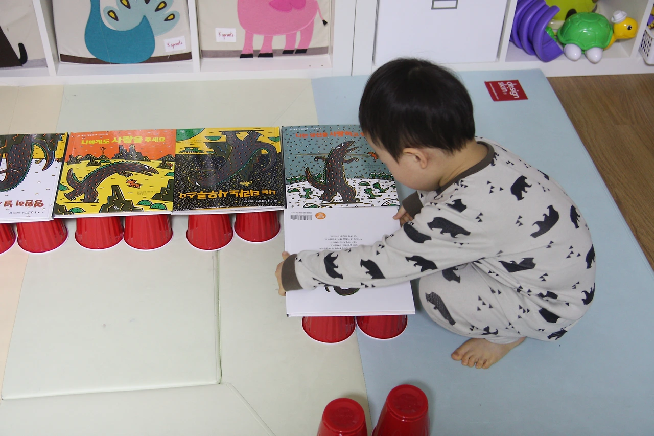 종이컵 4개 위에 동화책의 가운데가 되도록 균형을 잘 잡아줍니다.