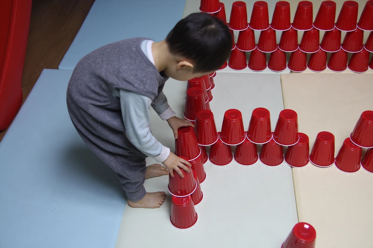 햇살 : "내가 내가 더 커." 라며 엄청 빠른 속도로 종이컵을 한 줄로 높이 쌓았어요.