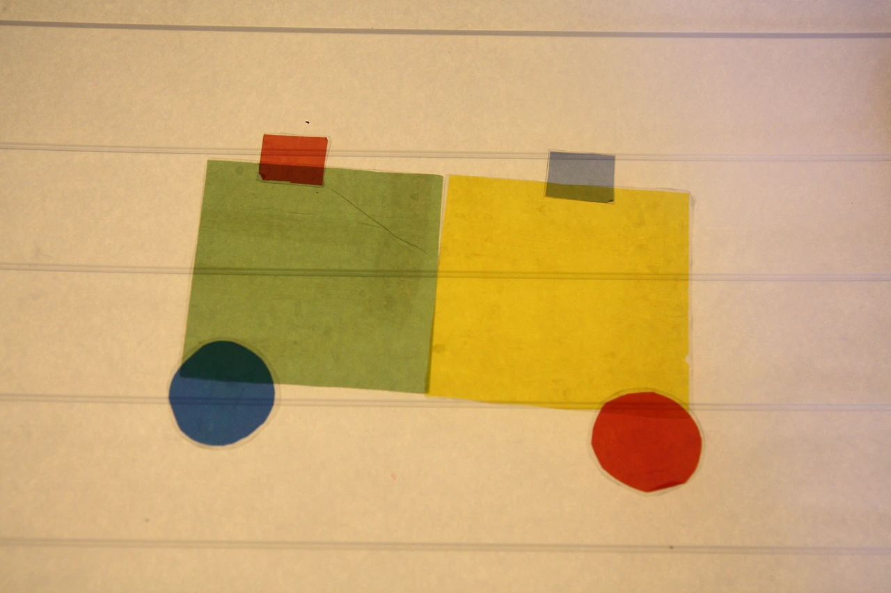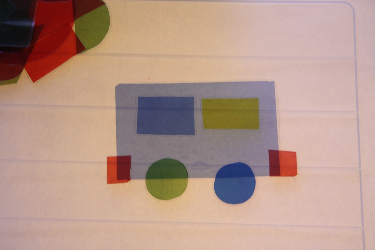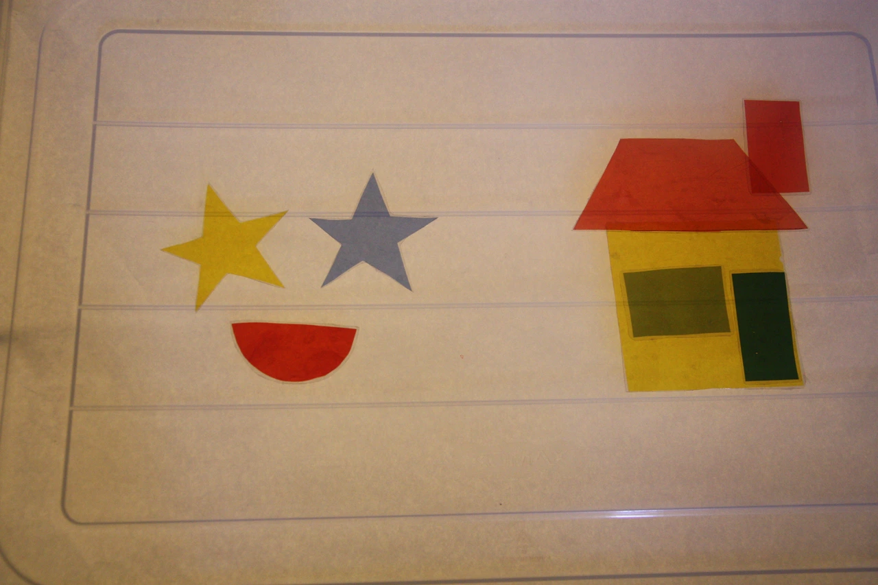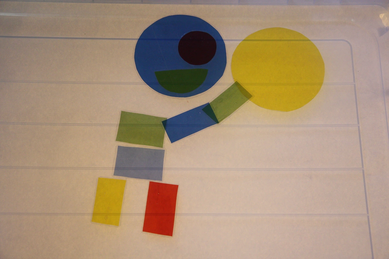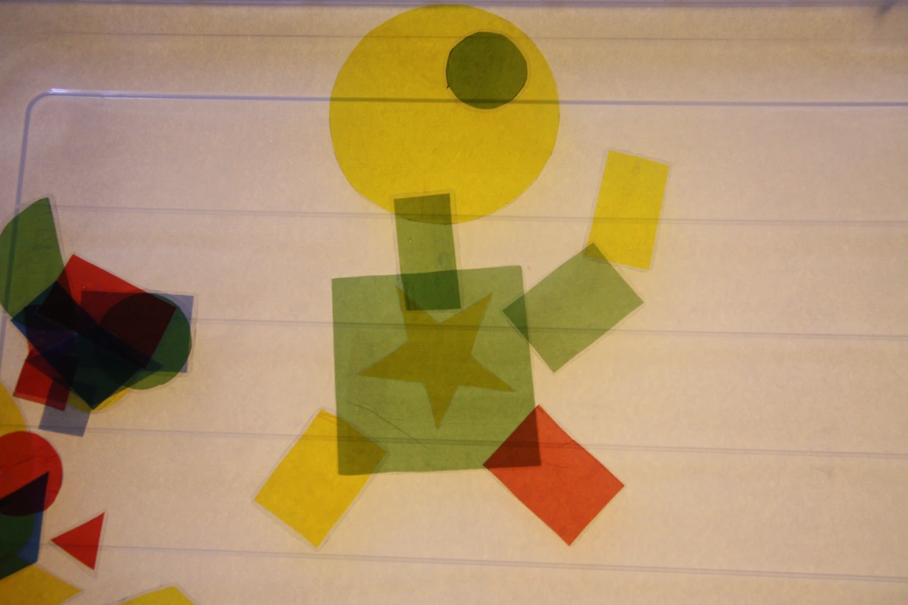 셀로판지로 만든 기본 도형을 이용하여 그림을 그리니