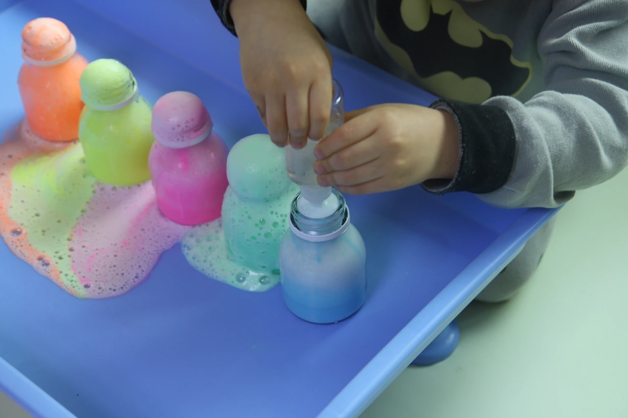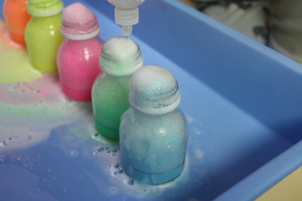 유리병에 베이킹 소다 + 물감 + 주방세제 다 넣은 후