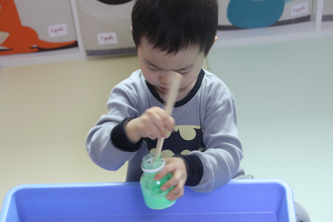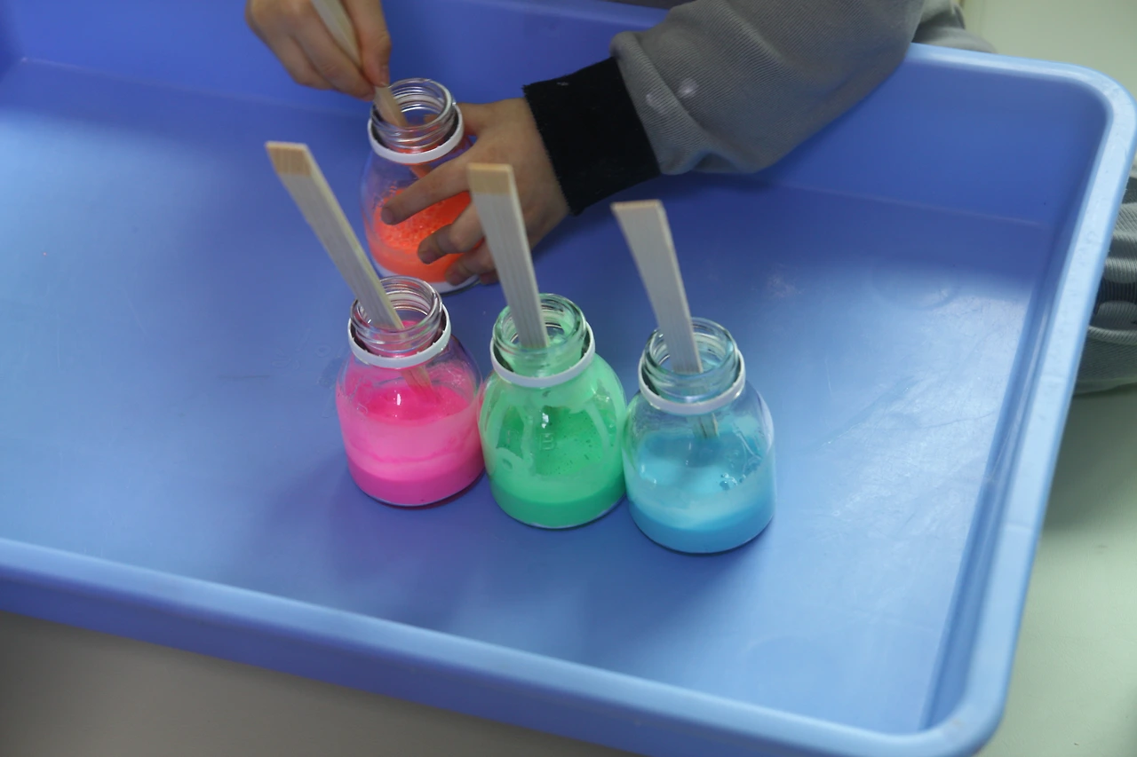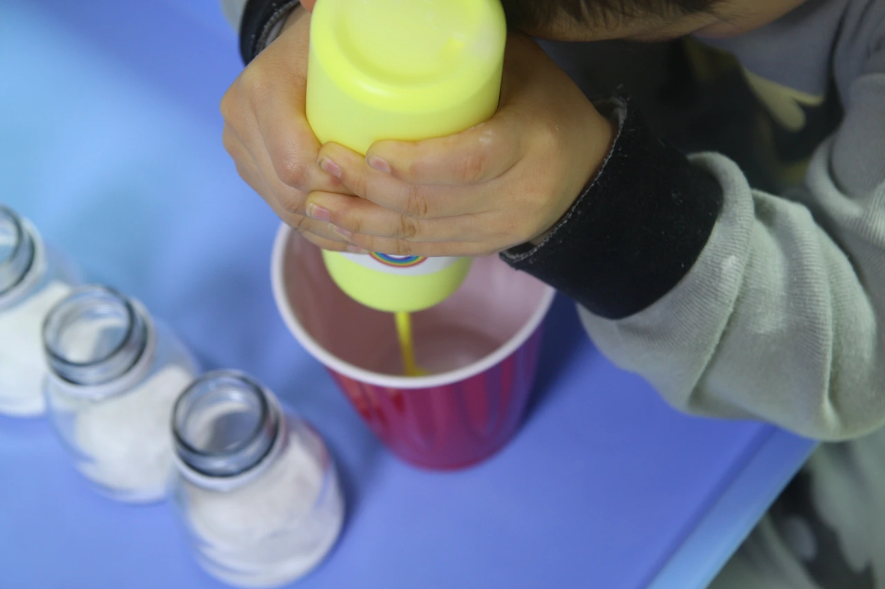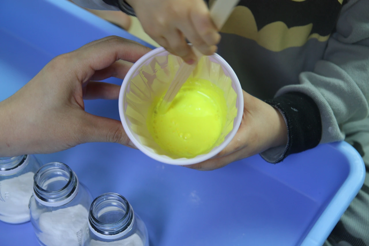 하나의 종이컵과 나무젓가락으로 물감과 주방세제를 섞어주면