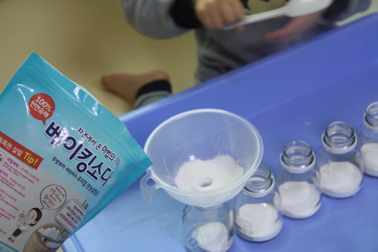 깔때기를 이용하면 엄마 도움 없이 아이 혼자서 용기에 베이킹 소다를 넣을 수 있어요.