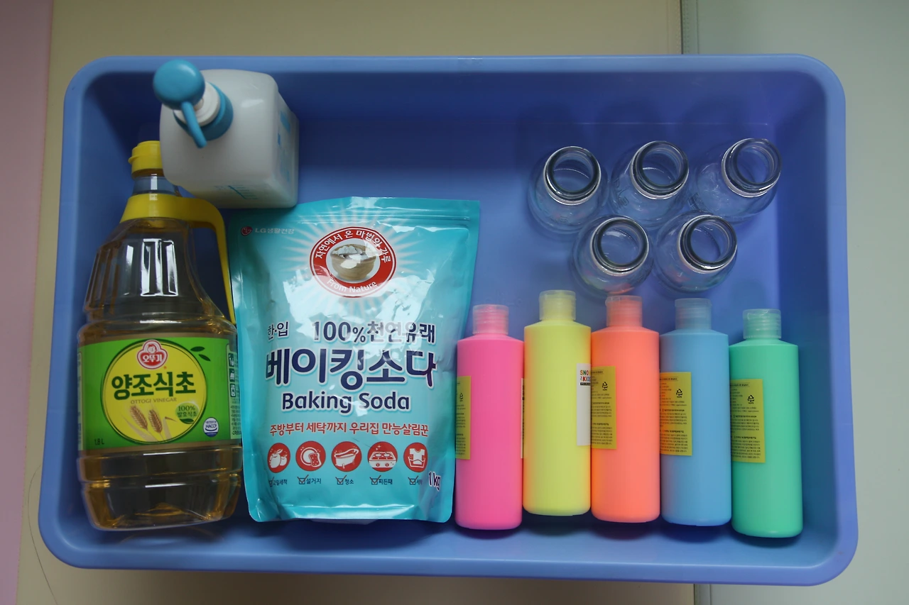 - 같은 크기의 투병한 용기 여러 개 (플라스틱병이나 주스 유리병 아무거나 사용 가능해요. 단, 입구가 너무 좁으면 베이킹 소다 넣기가 불편해요.)
