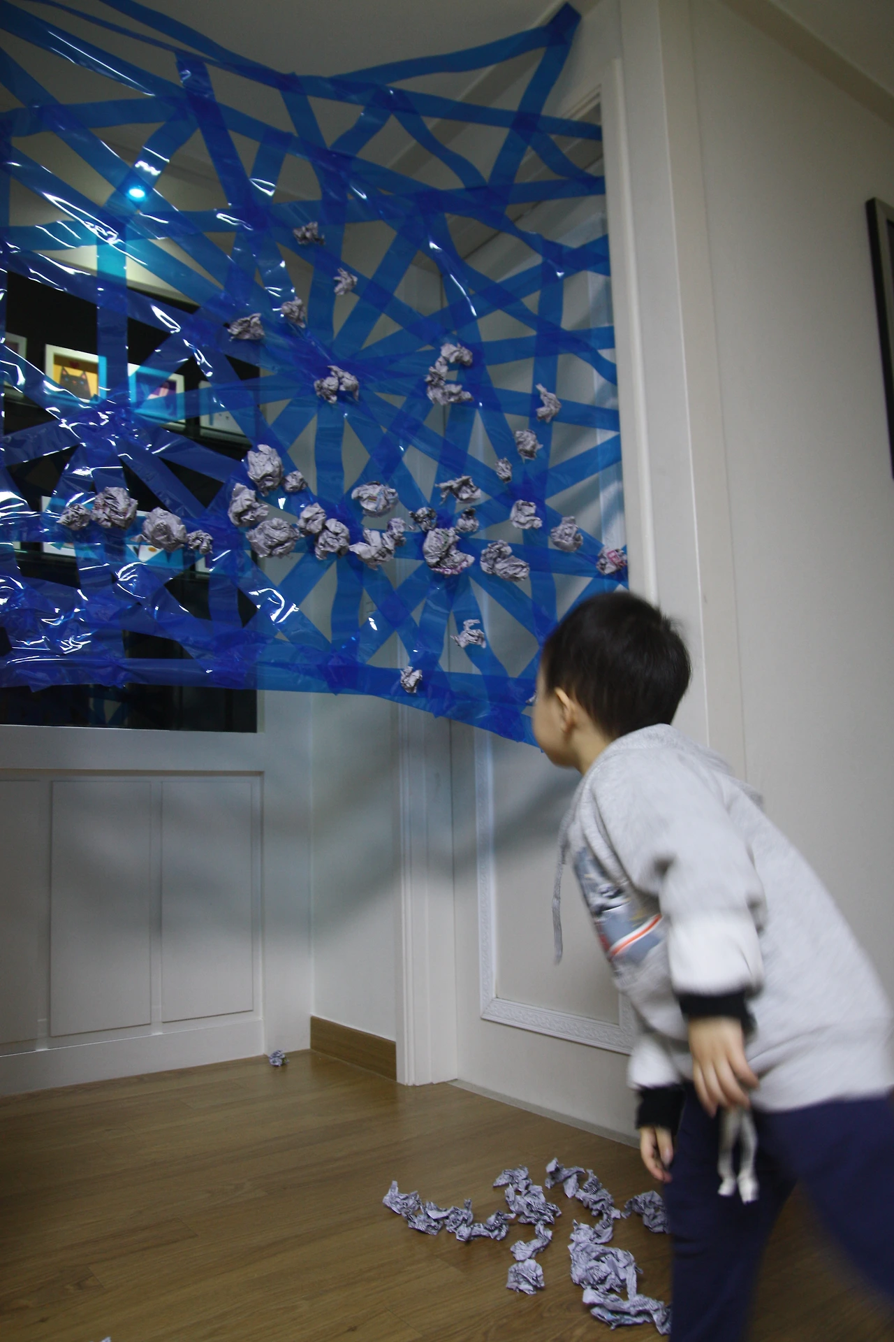 오늘의 놀이는 신문지공으로 거미줄에 던지는 거라서