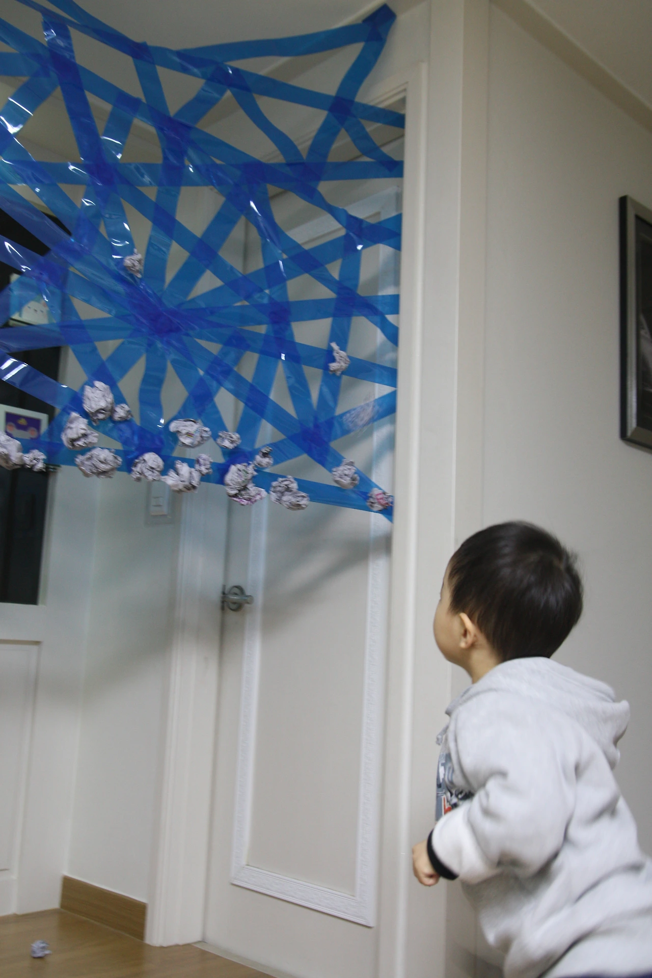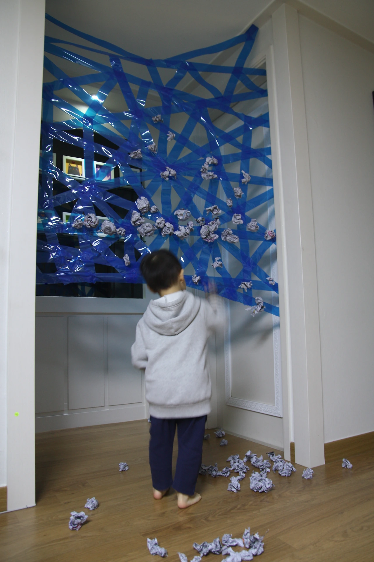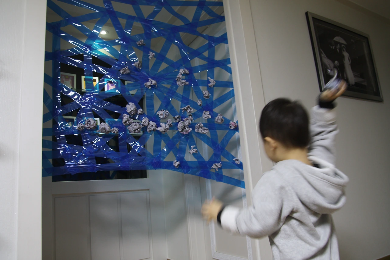 ③ 테이프로 만든 거미줄 바로 앞에서 신문지공을 던져보게 했어요.
