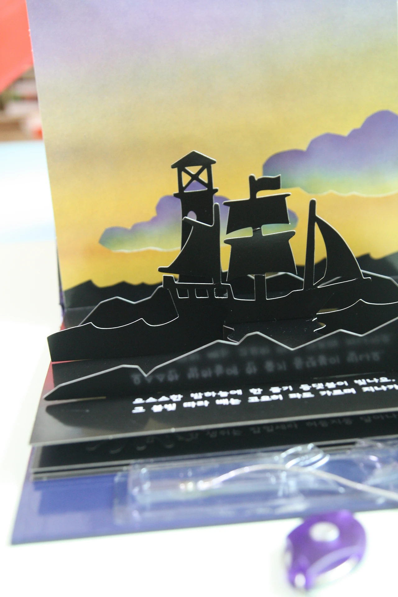 책에 붙어있는 꼬마 손전등을 비추면 뒤쪽으로 그림자가 생겨요.