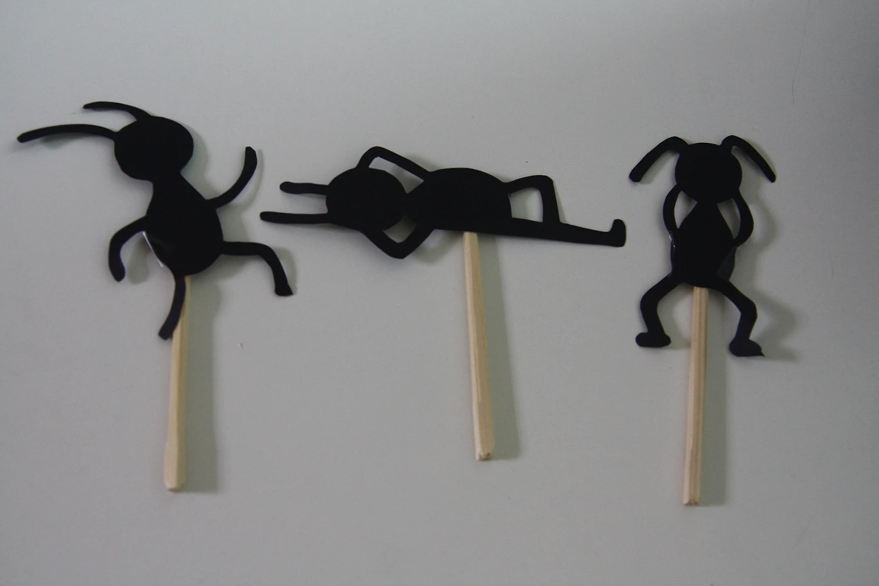 등장인물들을 검은색 종이로 오려서 나무젓가락을 붙여주었어요.